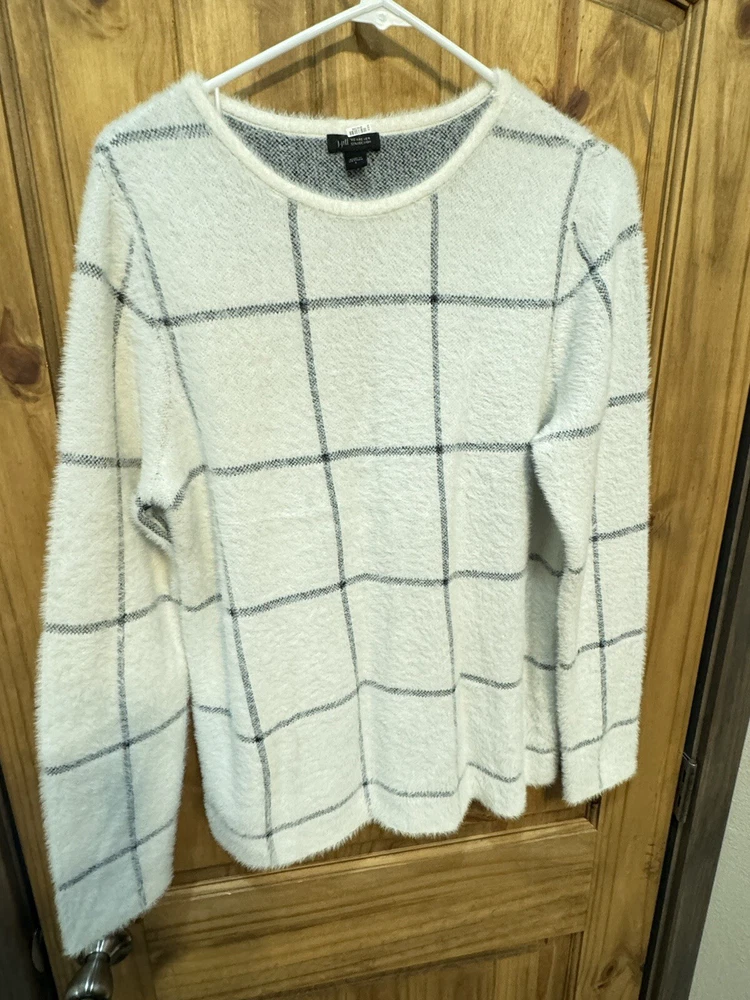 Elevate your wardrobe with this J. Jill Women's Wearever Windowpane Removable Snood Sweater in NC3 Cream/Black, size S. The sweater boasts a stylish ivory color and features a pullover style with a removable snood design. It is perfect for any occasion and can be dressed up or down effortlessly. The sweater is made from high-quality materials and is designed to be comfortable and durable. Whether you're going out with friends or running errands, this sweater is an excellent addition to your wardrobe.