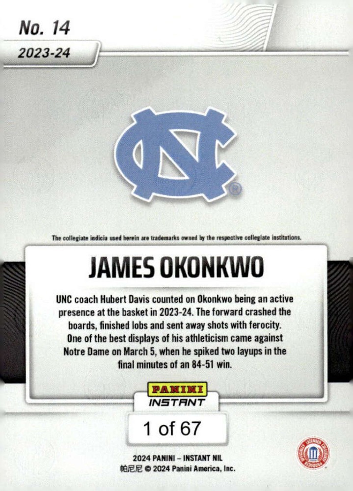 JAMES OKONKWO 2024 JAMES OKONKWO RC 2024 Panini Instant NIL Pre-ROOKIE #14 UNC PR:67 NM-MT NCAA Basketball NORTH CAROLINA TAR HEELS COMBINED SHIPPING AVAILABLE IF NOT ALREADY PAID FOR. PLEASE REQUEST IF NOT AUTOMATICALLY CALCULATED IN YOUR CART. All imperfection lines are from the scanner unless otherwise noted in the title and description. Request photos if concerned. Shipped to U.S. locations via USPS First Class Stamped Mail with eBay Tracking and up to $20 Insurance . Other delivery options available. COMBINED SHIPPING AVAILABLE IF NOT ALREADY PAID FOR. PLEASE REQUEST. Partial refunds for shipping and not available after payment is made. International orders are mailed via International Stamped Letter Mail and do not include tracking. If tracking is desired, please select during checkout. International Customers: Note that standard post is taking 2-5 weeks for delivery to many locations worldwide due to current conditions. Please be patient for receipt of order, or request to upgrade to trackable delivery for faster and more secure delivery. To do so, purchase, but DO NOT PAY upfront. Send a message requesting a trackable delivery quote and I will provide an invoice with this option. If prepaid, I cannot refund or modify delivery method. Thank y o u . This listing created with GLETech Multiple Selling Channel tools.