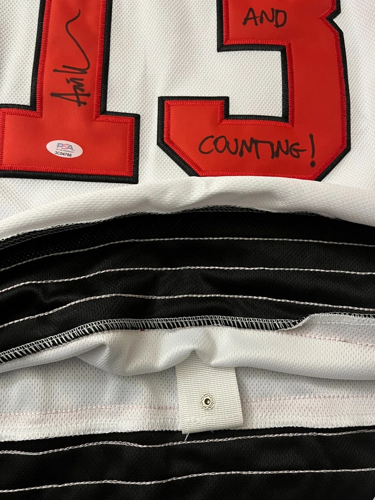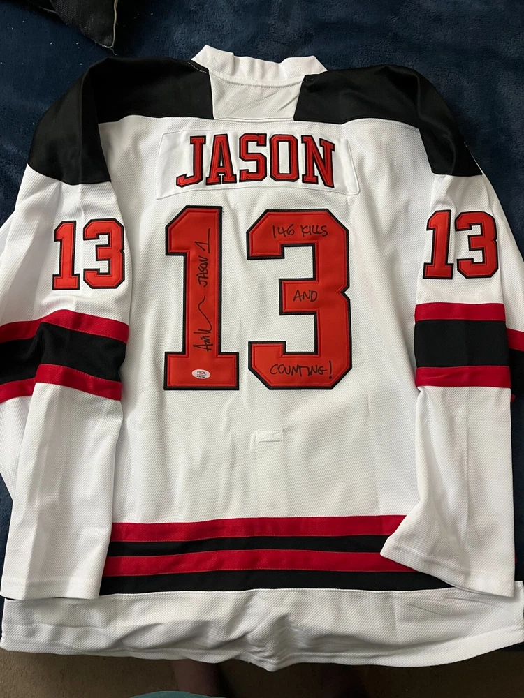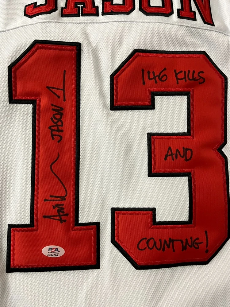 Embrace the spirit of the iconic horror film franchise with this autographed Jason Vorhees jersey by Ari Lehman, the actor who brought the character to life in "Friday the 13th." Authenticated by Professional Sports Authenticator (PSA), you can be assured of the genuineness of this prized collectible. The jersey, featuring the bold design of the Seattle Seahawks, is a must-have for fans and collectors alike. This original piece of memorabilia is signed by Ari Lehman himself, capturing a slice of movie history. Whether displayed in your home, office, or fan cave, this jersey is a unique testament to the enduring legacy of "Friday the 13th" and a tribute to the actor who played the part that scarred a generation. PSA DNA AUTHENTICATED- IN THE PRESENCE #3CO4780