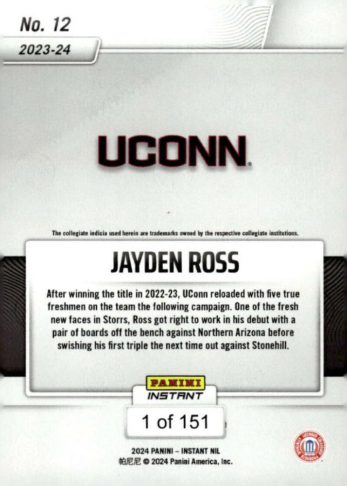 JAYDEN ROSS 2024 JAYDEN ROSS RC 2024 Panini Instant NIL Pre-ROOKIE #12 PR:151 UCONN NM-MT NCAA Basketball UCONN HUSKIES COMBINED SHIPPING AVAILABLE IF NOT ALREADY PAID FOR. PLEASE REQUEST IF NOT AUTOMATICALLY CALCULATED IN YOUR CART. All imperfection lines are from the scanner unless otherwise noted in the title and description. Request photos if concerned. Shipped to U.S. locations via USPS First Class Stamped Mail with eBay Tracking and up to $20 Insurance . Other delivery options available. COMBINED SHIPPING AVAILABLE IF NOT ALREADY PAID FOR. PLEASE REQUEST. Partial refunds for shipping and not available after payment is made. International orders are mailed via International Stamped Letter Mail and do not include tracking. If tracking is desired, please select during checkout. International Customers: Note that standard post is taking 2-5 weeks for delivery to many locations worldwide due to current conditions. Please be patient for receipt of order, or request to upgrade to trackable delivery for faster and more secure delivery. To do so, purchase, but DO NOT PAY upfront. Send a message requesting a trackable delivery quote and I will provide an invoice with this option. If prepaid, I cannot refund or modify delivery method. Thank y o u . This listing created with GLETech Multiple Selling Channel tools.