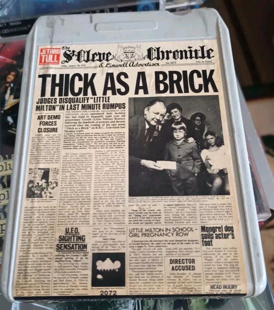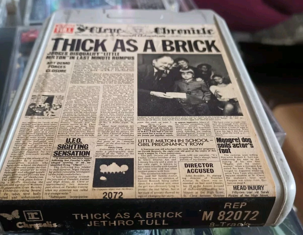 This vintage 8-track tape of Jethro Tull's "Thick as a Brick" is a rare find for any rock 'n' roll enthusiast. The cartridge is made of high-quality magnetic tape, and the fidelity level is very good, making the listening experience pleasant and immersive. The case is made of durable plastic, and the color is a classic gray. The inlay and cover conditions are very good plus, adding to the overall value of this piece. The catalogue number is 82072, and the release year is 1972. This 8-track tape is a must-have for any collector or fan of classic rock.