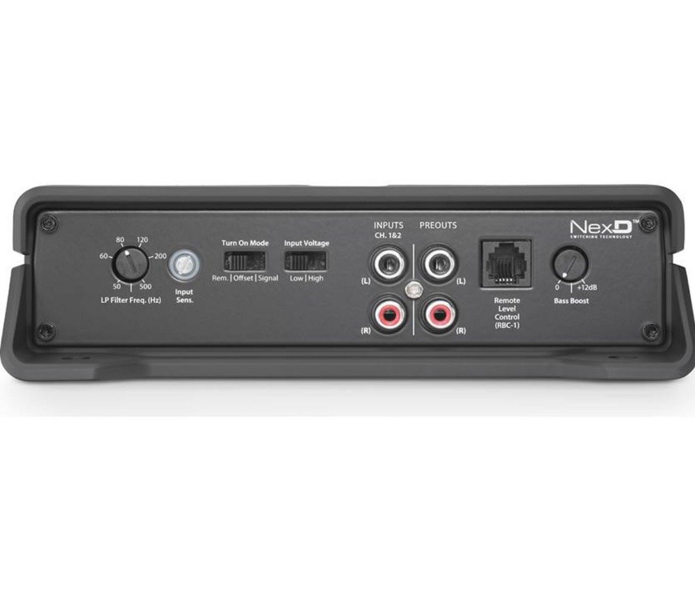 Product highlights: mono subwoofer amplifier 600 watts RMS x 1 at 4 ohms 1000 watts RMS x 1 at 2 ohms Class D amp design with NexD™ switching technology frequency response: 7-500 Hz variable low-pass filter (50-500 Hz, 12 dB/octave) variable bass boost (0-12 dB at 45 Hz) More Info: optional RBC-1 wired remote level control preamp inputs and outputs differential-balanced inputs prevent noise speaker-level input via speaker wire-to-RCA adapters signal-sensing turn-on with speaker-level inputs wiring, fuse, and hardware not included with amplifier 4-gauge power and ground leads and an 80-amp fuse recommended dimensions: 11-3/4"W x 2-1/8"H x 7-1/2"D Warranty 1 year