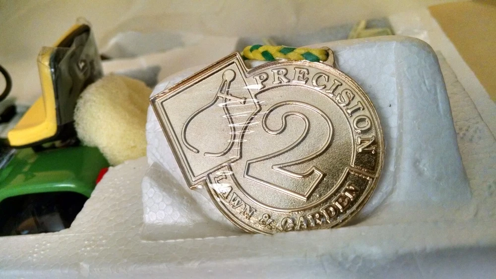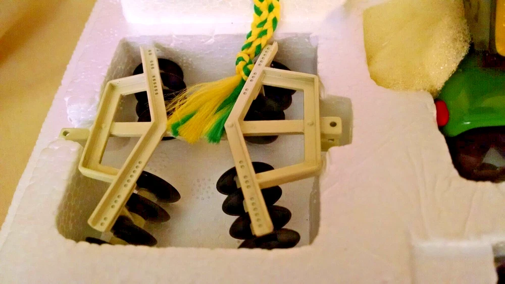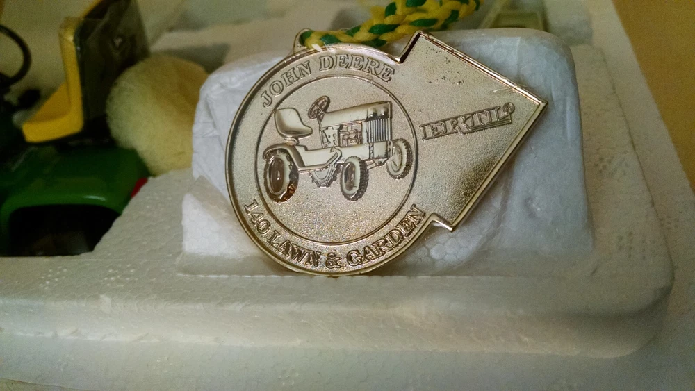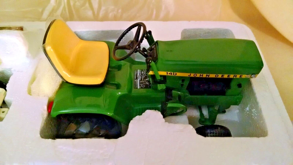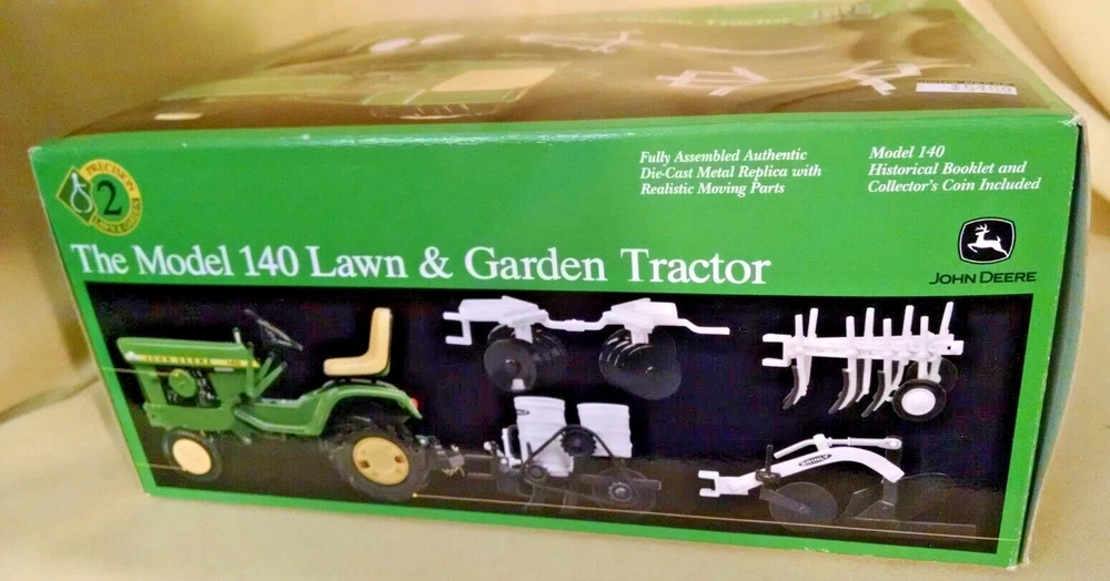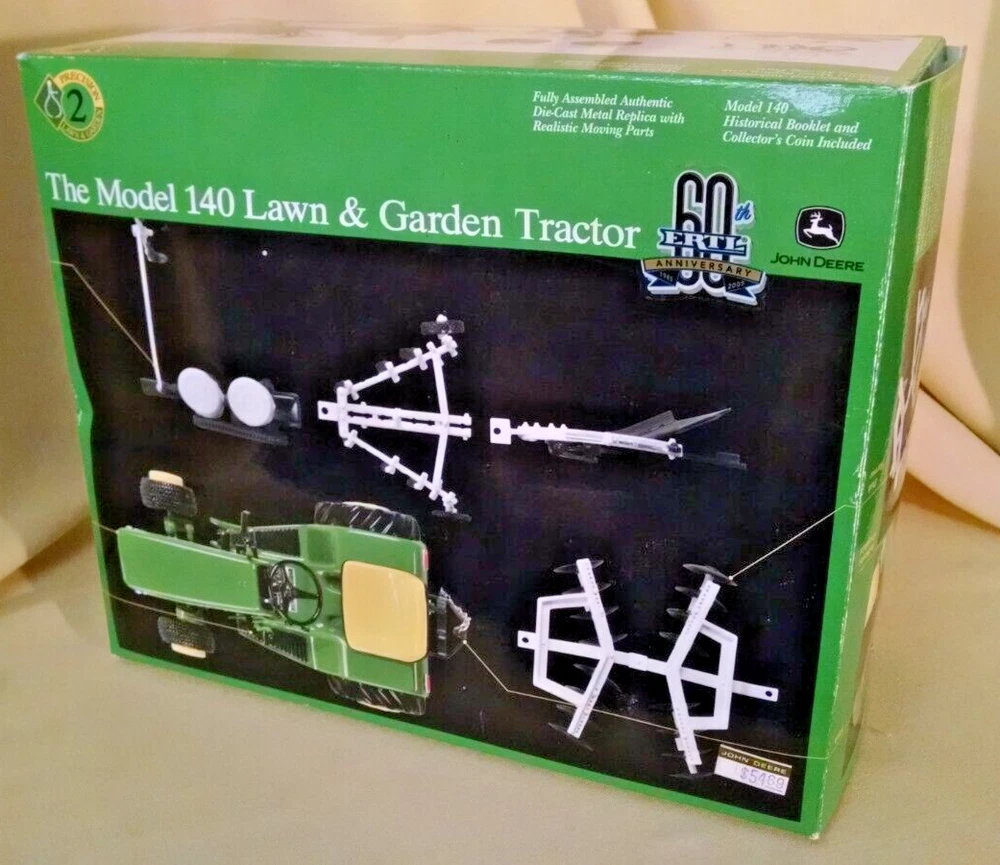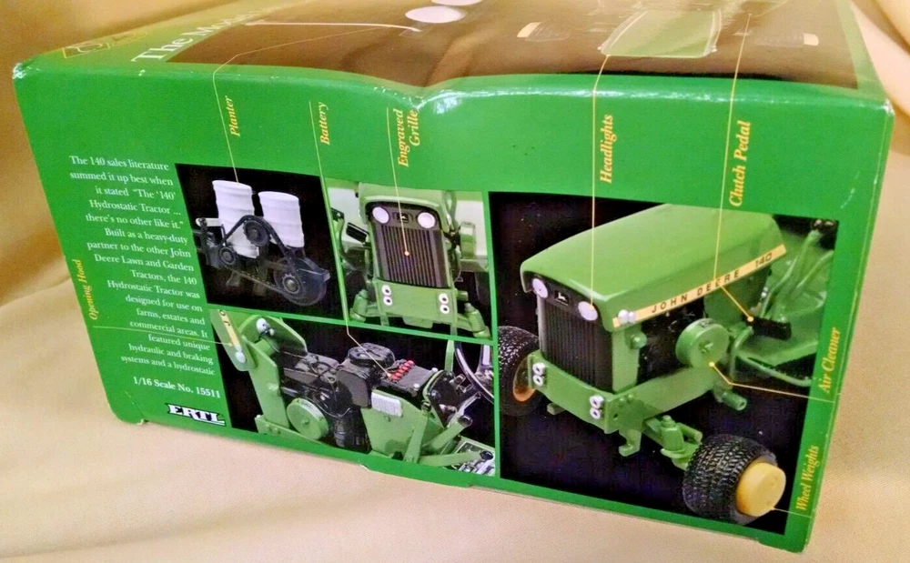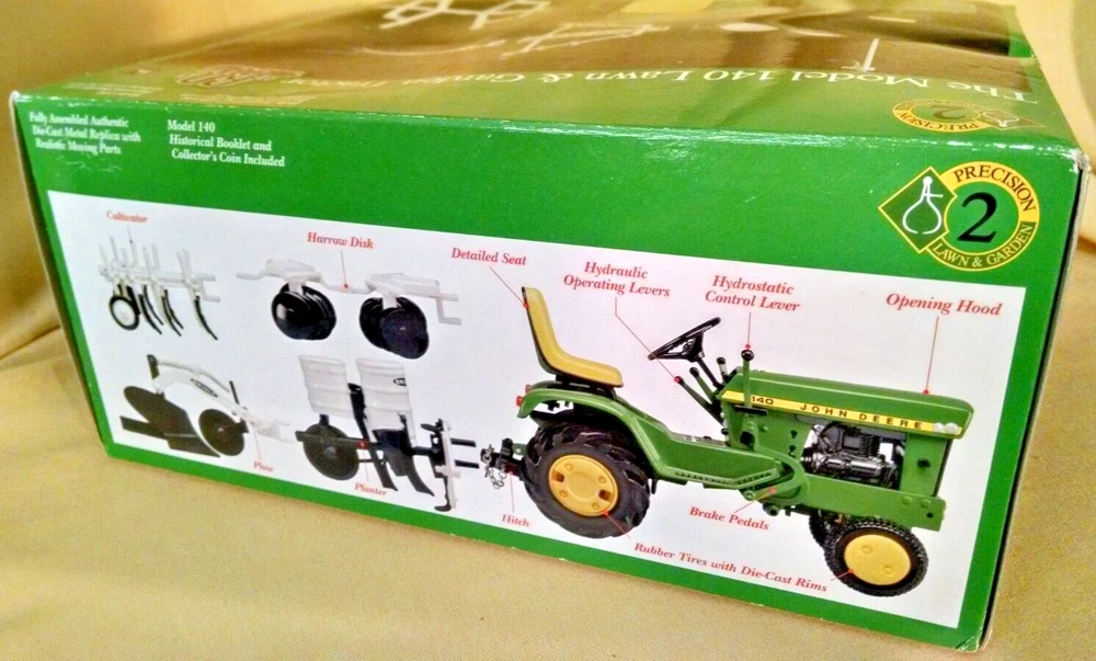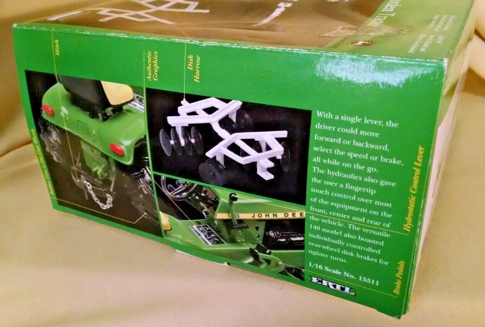 ** You are bidding on a John Deere Model 140 Hydrostatic Lawn & Garden Tractor with Attachment 60 th Anniversary Ertl – Precision 2 Lawn & Garden, Fully Assembled Authentic Die Cast Metal Replica with Realistic Moving Parts, includes Historical Booklet and Collector’s Coin – in 1:16 Scale No. 15511 by Ertl, Opening Hood, Planter, Battery, Engraved Grill, Headlights, Clutch Panel, Wheel Weights, Air Cleaner, Hitch, Rubber Tires with Die Cast Wheels, Authentic Graphics Disk Harrow, Hydrostatic Control Lever, Brake Pedals, Cultivator, Plow – booklet is still sealed and states “From the 1969 Promotional Material” - dated 2005 RC2 Brands, Inc., Made in China, Officially Licensed Product for Adult Collectors, Bar Code 036881155119 #15511 – box measures 9 1/8 by 7 5/8 by 4 inches – box shows some shelf wear, a bit misshapen, original John Deere price tag still attached on the front, box is open and tape is broken, inside items are in good and clean condition with original packaging – comes to you in As Is Condition. {34691.2492510} I am by no means an expert, so please feel free to ask plenty of questions. I will ship USPS - either Priority or Standard Post depending on the size and weight of the item. Please note that if you are bidding from outside of the United States, the shipping will be more expensive. Please contact me regarding a quote on shipping or refer to the Shipping Calculator for shipping charges. In all instances, please wait for an invoice before paying so that I can give you the correct amount for shipping and handling. I only accept PayPal due to EBay's requirements. I am always happy to provide additional pictures or answer additional questions. Please note that I will reply during the evening hours since I am may be unavailable to my computer during the daytime hours. Your purchase comes from a clean, smoke free, pet free home. I try to describe the overall condition as best possible. Please ask questions BEFORE bidding. Your purchase is FINAL and NO REFUNDS will be given. Also, please note that you are buying this item AS IS ? be aware of any toy recalls if necessary and know that you are purchasing a collectible for an adult versus a toy for a child. I do not add insurance automatically - if you would like to insure your item, please let me know. Please contact me within 48 hours of receiving your invoice so that we can make payment/delivery arrangements. Note that payment is due within a week of receiving your invoice; if not, I will file a Non Paying Bidder form at that time. Please see my other auctions - add toydaze49 to your favorites!!! Thanks and good luck! **Please note that display materials may have been used as a prop behind the Auction Item and will not be included in the Auction unless specifically indicated. **