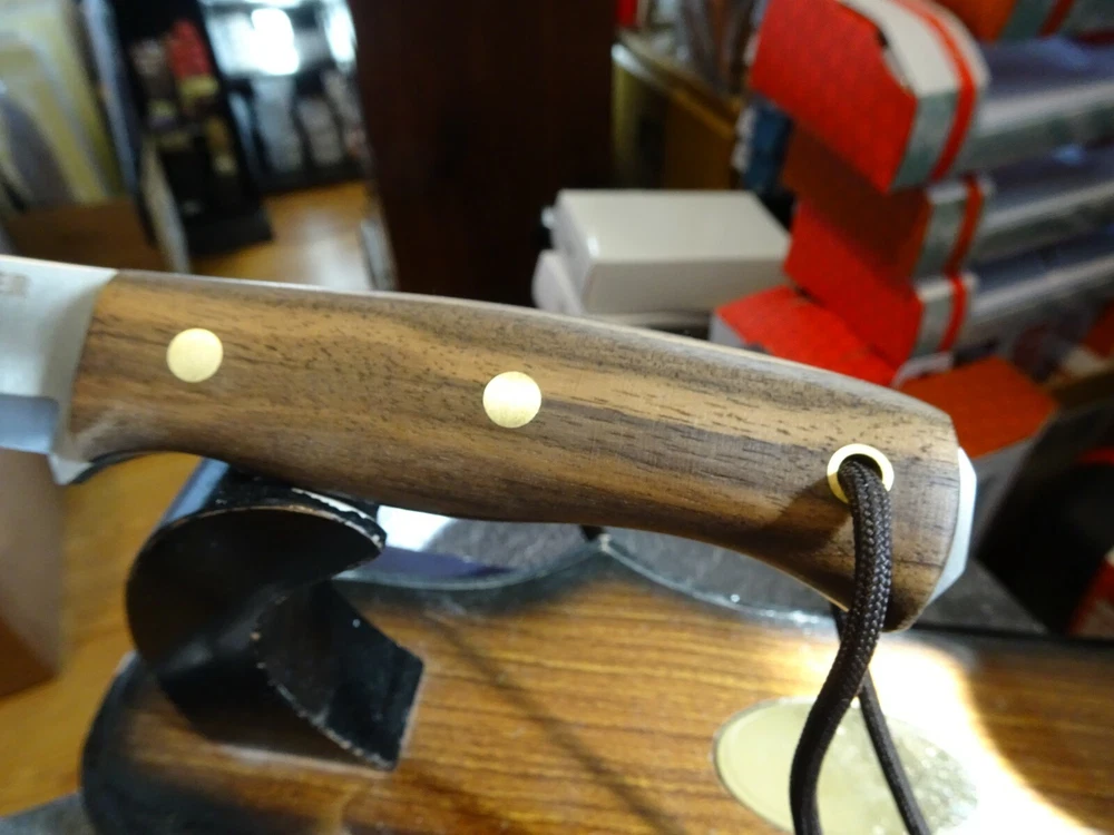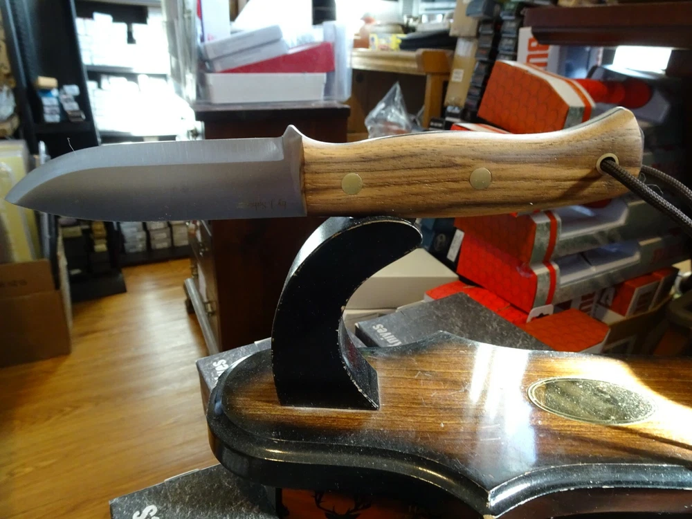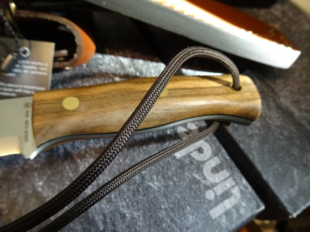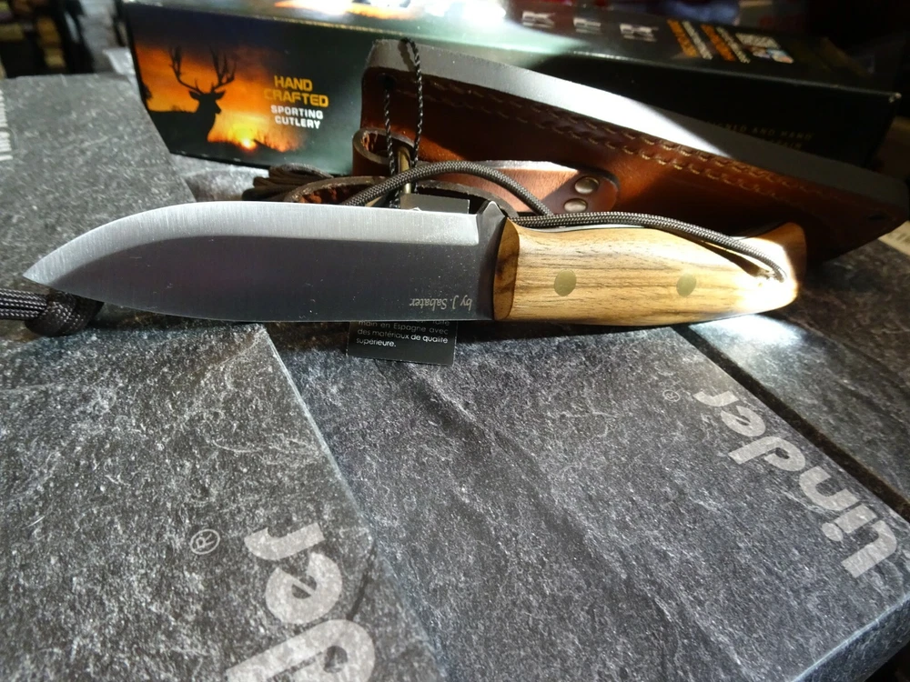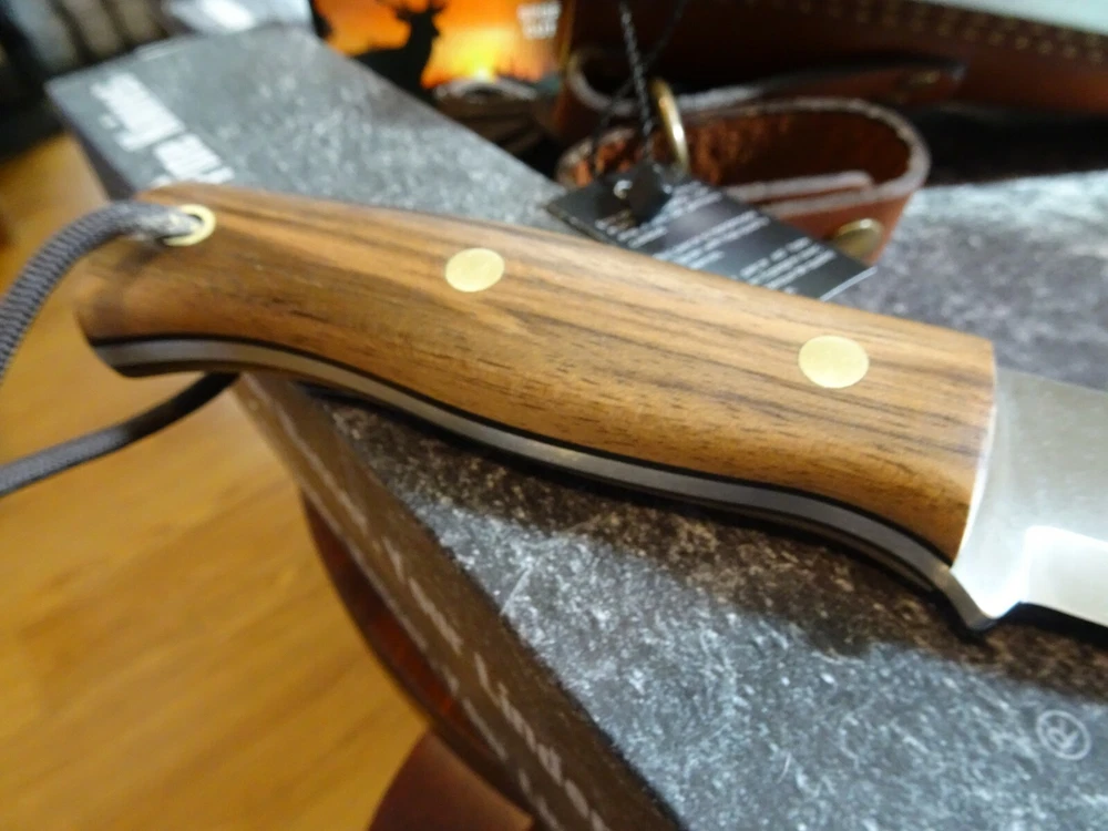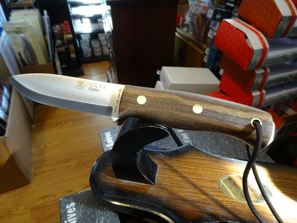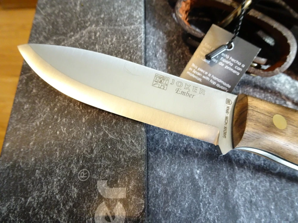 JOKER BRAND CUTLERY HANDCRAFTED SPORTING CUTLERY 8.88" WOOD / WALNUT HANDLE BUSHCRAFT SURVIVAL KNIFE, CN-122 MADE IN VERY LOW QUANTITIES, AND HAS A VERY SHARP BLADE PLUS A GENUINE EMBER WOOD HANDLE AND A 4" LONG SANDVIK 14C28N STAINLESS STEEL BLADE DROP POINT. THIS IS THE ONLY KNIFE WE HAVE WITH THIS ALLOY FOR THE BLADE. DESIGNED BY J. SABATER in very Limited Quantities only 450 knives made this year. Only 3 left, This Joker Brand of Hand-Made Sporting Cutlery is called "EMBER" BS-9 Model # JKRCN122, Weight 6.1oz. with the leather sheath 9.5oz. The Blade is very sharp 4" long with a 4" blade edge, 1 1/8" wide, 1/8" thick, Full Tang Construction, and a Drop Point Design we have no other blade that looks like this one does. The Handle is a High-Grade of EMBER which is a wood type Walnut it is used mainly for hand-made high dollar gifts. with a ton of grain giving it a great look, they cut finger grooves into the wood and put two 1/4" Brass Rivets in the handle and a Lanyard Hole with a tie-down then all of this goes into a Brown High-Grade Leather Belt Sheath double-stitched and riveted and it has a safety ring. The handle is Ember a type of walnut wood and this is the 1st time I have had a knife with this type of handle so I looked it up and found diddly everything I read was about a hot coal in a fire, but looking even future I did find people use it for hand made carved expensive gifts of all kinds. We also wanted to tell you about the alloy, Sandvik 14C28N ® is a martensitic stainless chromium steel with a chemistry optimized for high quality professional knife applications. The chemical composition provides a unique combination of properties including: Excellent edge performance Very high hardness Good corrosion resistance Sandvik 14C28N ® is mainly recommended for knife applications which put very high demands on edge sharpness, edge stability and corrosion resistance. Examples are pocket knives, chefs knives, hunting knives and fishing knives. FEATURES; 8.88" overall. 4" satin finish 14C28N Sandvik stainless Scandi grind blade. Walnut handle. Full, extended tang. Lanyard hole. Includes 2m of 550 paracord. Brown leather belt sheath We put 12 pictures of this very high-quality Joker Bushcraft Knife for you to view, you should also know these are sold-out we just got the last of what Joker had this is one beautiful knife you may want to look at it very hard. Again we found Joker is using two superior materials to make this knife . and we will give you $$$$$$$$$$$$$$$$$$$$$$ FREE SHIPPING $$$$$$$$$$$$$$$$$$$$$$$$$$ to help get one in your hands, in the U.S. only. WE THANK YOU AND GOD BLESS YOU. by adding my eBay Store to your Favorites, . - Sign up and receive our emails, why SALES that is the only email we will ever send to you. We are always trying to get different knives into your hands, so by saving you some money maybe you will try out a new brand. Plus every listing we have is put on sale from the highest to the lowest priced items, and lastly many times we put knives that there are only 1 or 2 left in our stock by receiving our email you will get first shot at these items, Thank you Greg
