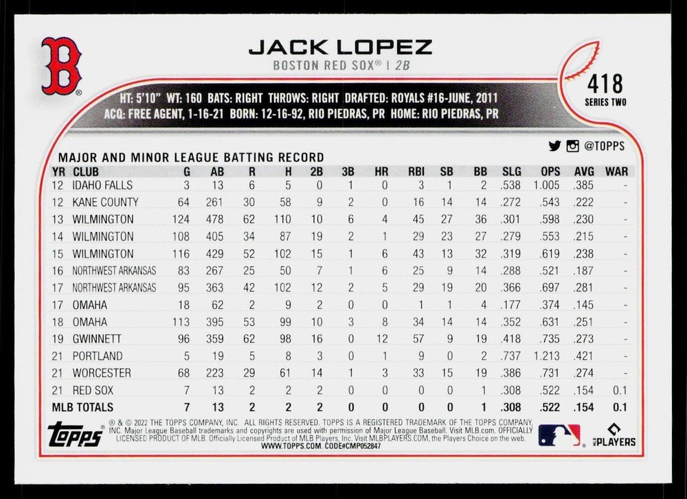 You will receive a , Jack Lopez 2022 Topps #418 Boston Red Sox Near Mint or Better condition. Please note i am not a professional card grader the condition of raw cards can be very subjective. Please refer to the high quality pictures to determine condition yourself any questions at all please feel free to ask!! we take pride in the quality of cards we sell and ship, all cards will be shipped in a penny sleeve and top loader for added protection. be sure to save us as a seller, as we are growing and listing daily THANK YOU FOR YOUR BUSINESS