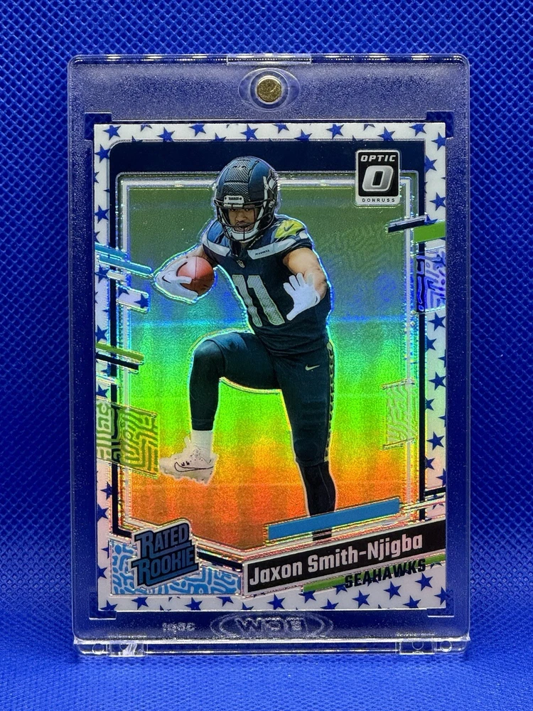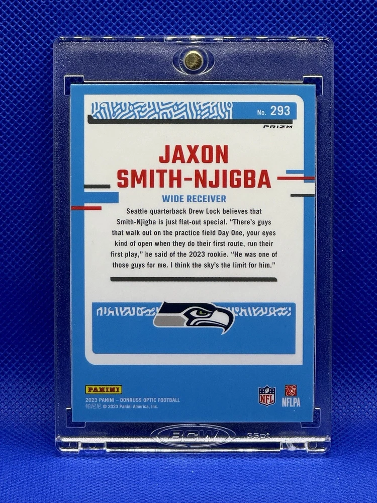 Year Manufactured: 2023 Parallel/Variety: Rookie Sport: Football Manufacturer: Panini Player/Athlete: Jaxon Smith-Njigba Season: 2023 Type: Sports Trading Card Team: Seattle Seahawks Card Thickness: 20 Pt. Card Size: Standard Card Name: SSP Set: 2023 Panini Prizm Original/Licensed Reprint: Original Autographed: No Country/Region of Manufacture: United States Language: English Card Number: 293 Event/Tournament: Super Bowl Features: 1st Edition, Base Set, Chase, Collectors Edition, Embossed, Exchange/Redemption, Exclusive, Hologram, Insert, Limited Edition, Parallel/Variety, Rookie, Short Print Material: Card Stock