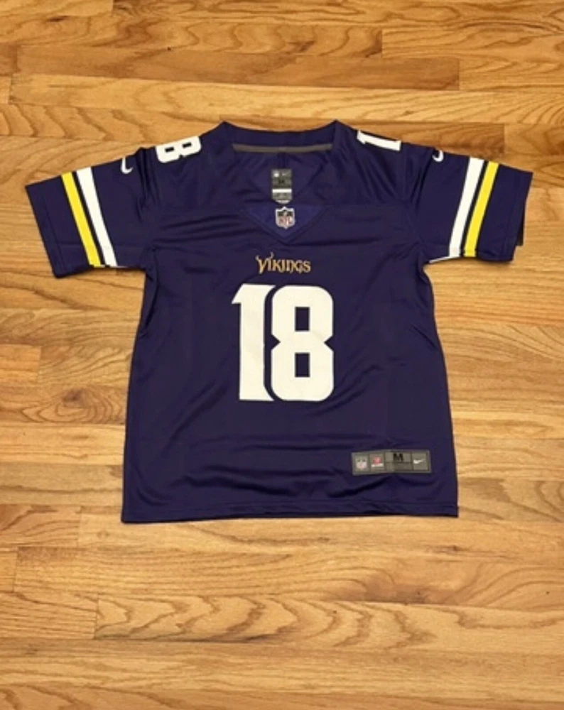 Jefferson #18 Vikings KIDS Jersey White Numbers YOUTH MEDIUM Stitched Player Rep. Jersey Approximately 22in from shoulder to waist and 18in from armpit to armpit.