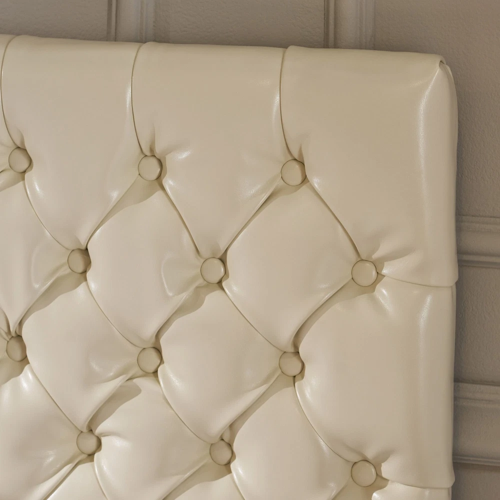 Bring an expensive, French look to your bedroom with this diamondpattern tufted headboard. At 26 inches tall, this verticallyadjusting upholstered headboard is the perfect upgrade to almostany queen-sized bed. It stands on black iron legs and is sold inlight beige, ivory and sand colors, making it a versatiledecoration piece for any bedroom. This beautiful headboard features a stylish design thatcreates a classy touch for your bedroom. This piece stands on blackiron legs and is available in light beige, ivory and sand colors,making it easy to match with other bedroom decor. For an expensivelook and feel, this headboard delivers excellent quality. Materials options: Polyester blend, leather Color: Light beige, ivory, sand Features: Button diamond tufted fabric Black iron legs Able Free Shipping Over $49.99* Details Jezebel Adjustable Full/Queen Tufted Headboard by Christopher Knight Home Product Description: Bring an expensive, French look to your bedroom with this diamondpattern tufted headboard. At 26 inches tall, this verticallyadjusting upholstered headboard is the perfect upgrade to almostany queen-sized bed. It stands on black iron legs and is sold inlight beige, ivory and sand colors, making it a versatiledecoration piece for any bedroom. This beautiful headboard features a stylish design thatcreates a classy touch for your bedroom. This piece stands on blackiron legs and is available in light beige, ivory and sand colors,making it easy to match with other bedroom decor. For an expensivelook and feel, this headboard delivers excellent quality. Materials optionsPolyester blend, leather ColorLight beige, ivory, sand FeaturesButton diamond tufted fabric Black iron legs Able to adjust to most queen and full metal bed frames Some assembly required Adjusts within 5 inches of the listed height Dimensions49.38 inches high x 62.20 inches wide x 3.15 inches deep Headboard25.98 inches high