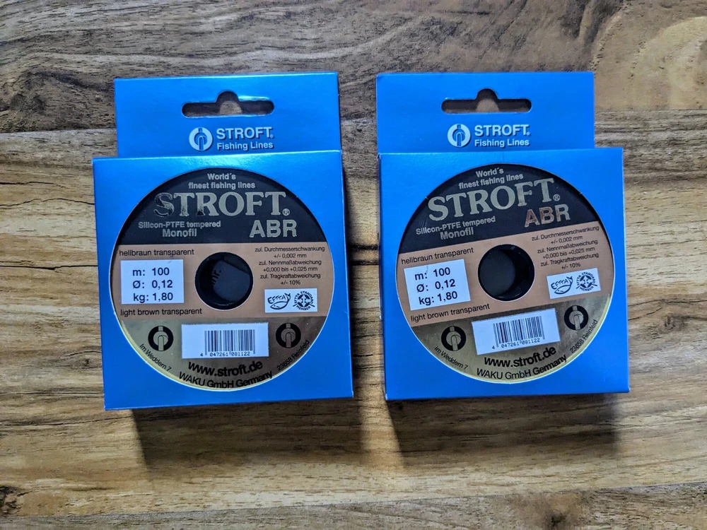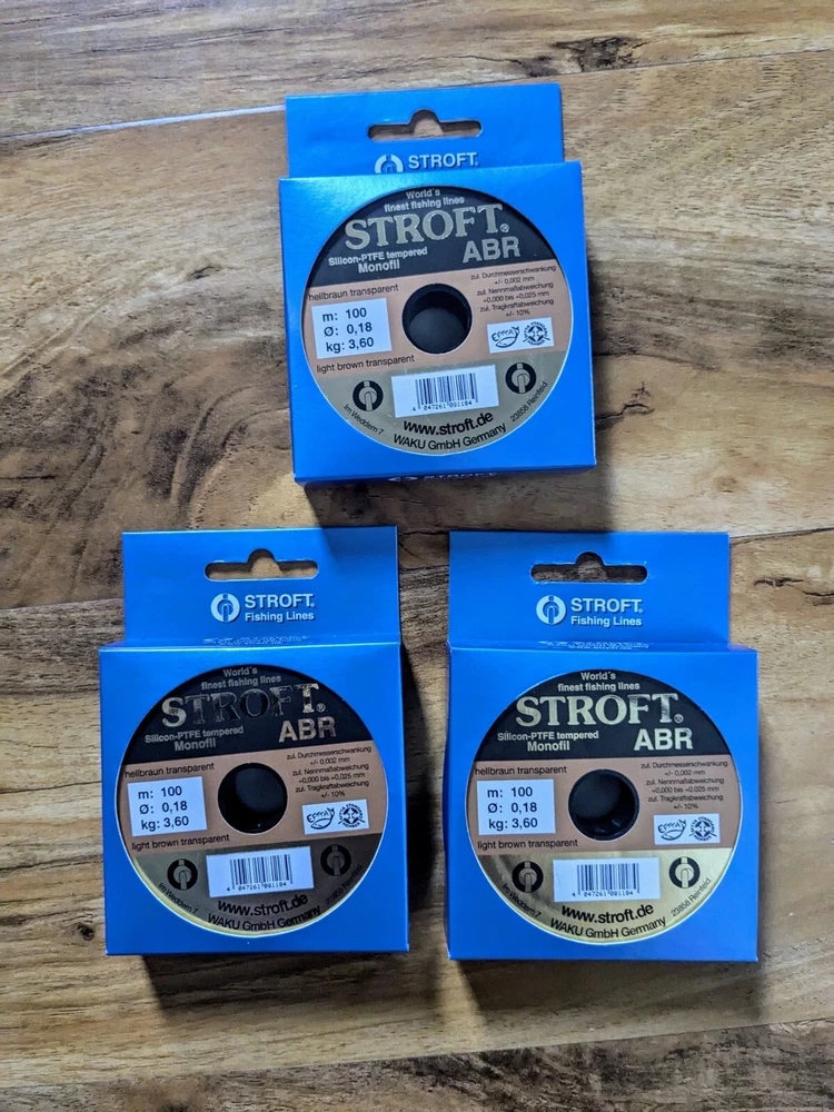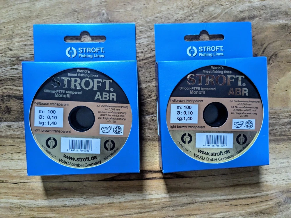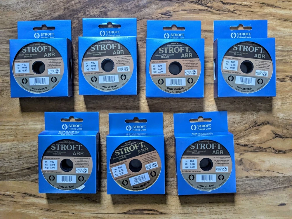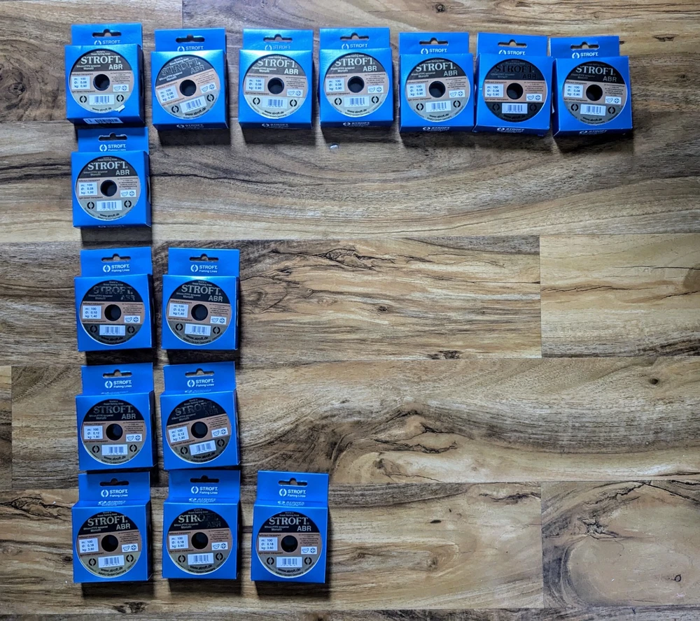 Dave's Discount Fishing Job Lot Stroft ABR Monofilament Fishing Line 15 spools of Stroft ABR Monofilament Fishing Line. Silicon PTFE tempered mono 100m. 7 x 0.9kg 1 x 1kg 2 x 1.4kg 2 x 1.8kg 3 x 3.6kg Brand new We aim to sell all our products below RRP Check out our shop for more great deals Most items listed have been purchased as bankrupt stock so even new/new other products may not be subject to any manufacturers warranty. We do our best to select great quality used items to sell but please be aware that all used items may show signs of cosmetic wear and tear. Please note that items over 120cm in length cannot be sent to outside the mainland UK due to high postage costs. Any rod over 150cm to Scotland will incur extra charges for delivery. Unfortunately we cannot post to either Northern Ireland or Europe.