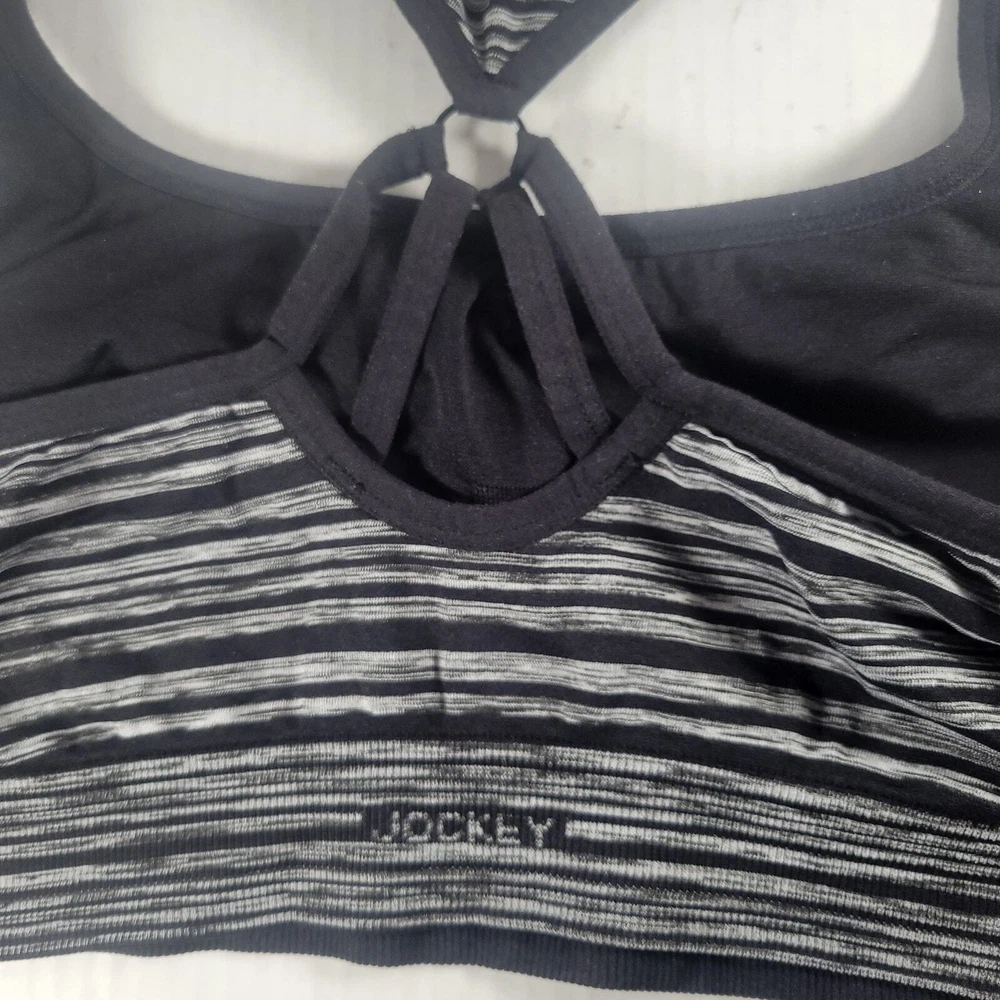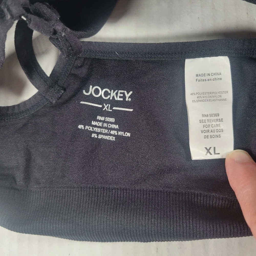 This Jockey Sports Bra in size XL is perfect for women who want to combine comfort and style. The bra features a solid black color and wide straps for added support. It also has a pullover closure for easy wear and is wireless, meaning it doesn't have any underwire. The bra is padded for added coverage and has a sports-style design, making it perfect for athletic activities. It is made by Jockey, a trusted brand in the industry, and is available in regular size. This Sports Bra is a great addition to any wardrobe and is perfect for those who want to feel comfortable and stylish while exercising.
