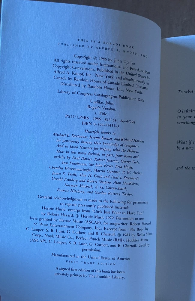 John Updike / Roger's Version Signed Limited 1st Edition 1986 numbered #291 out of 350 in near fine condition. Starting bidding well under original cost and current value, so grab a deal! Additional items ship for $1!
