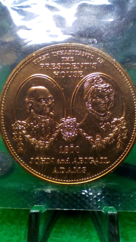 United States mint medal honoring the White House and John and Abigail Adams with the date 1800. 1.5 inch bronze in original mint cellophane. The medal in the pic is the one you will recieve.