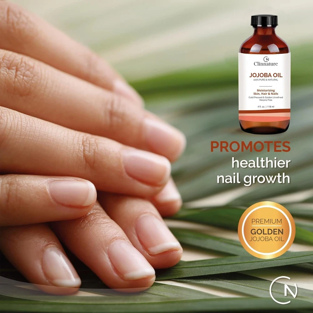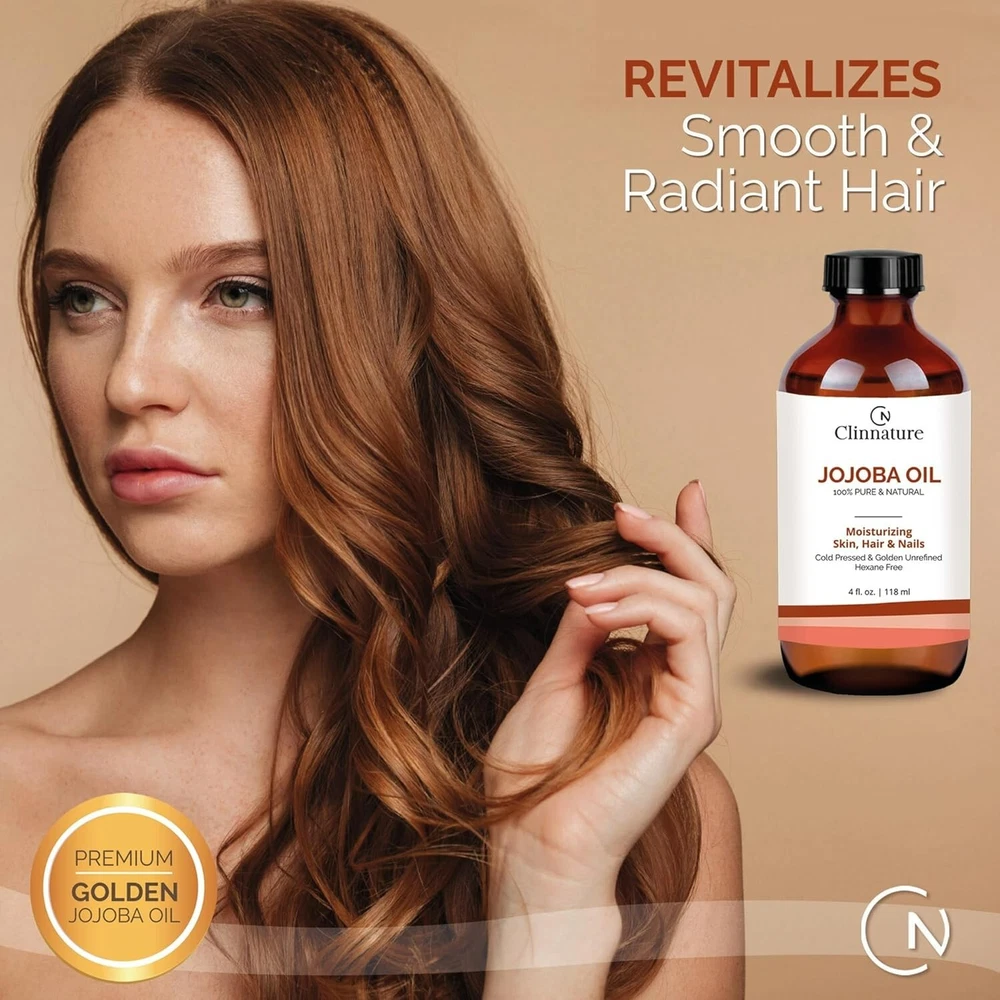 Jojoba Golden Oil 100% Pure & Natural | Cold Pressed | Hexane-Free | For Hair & Skin & Nails, Dermaplaning & Anti-aging 4 Fl. Oz. (118 ml) Glass Bottle | Includes Free Dropper. Brand CLINNATURE Item Volume 4 Fluid Ounces Item dimensions L x W x H 2 x 2 x 4.53 inches Age Range (Description) Adult Special Feature Not Tested On Animals, Travel Size, Aromatherapy, Natural Ingredients About this item ✅ 100% PURE JOJOBA OIL: Our Jojoba Golden Oil is 100% pure, providing the perfect facial oil for dermaplaning and enhancing natural beauty. A jojoba oil perfect for face care, moisturizing and nourishing your skin." ✅ COLD PRESSED AND HEXANE-FREE: Our Jojoba Golden Oil cold pressing process ensures that the oil retains its nutrients. It is hexane-free, unrefined, making it a safe and pure Jojoba Golden Oil for your skin and hair care regimen." ✅ MOISTURIZING & NOURISHING: This skin jojoba oil provides intense hydration, promoting healthier, smoother skin. " ✅ IDEAL FOR DERMAPLANING: This dermaplaning face oil helps create a smooth surface for flawless makeup application. It's also a dermaplaning oil for the face, which helps remove dead skin cells and reveals a youthful glow." ✅ ANTI-AGING FACE OIL: These are the perfect facial oils for facial anti-aging, reducing the appearance of fine lines and wrinkles