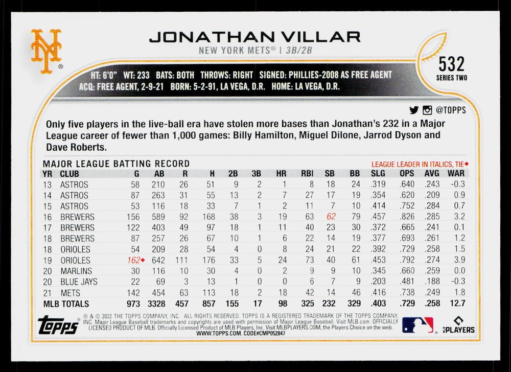 You will receive a , Jonathan Villar 2022 Topps #532 New York Mets Near Mint or Better condition. Please note i am not a professional card grader the condition of raw cards can be very subjective. Please refer to the high quality pictures to determine condition yourself any questions at all please feel free to ask!! we take pride in the quality of cards we sell and ship, all cards will be shipped in a penny sleeve and top loader for added protection. be sure to save us as a seller, as we are growing and listing daily THANK YOU FOR YOUR BUSINESS