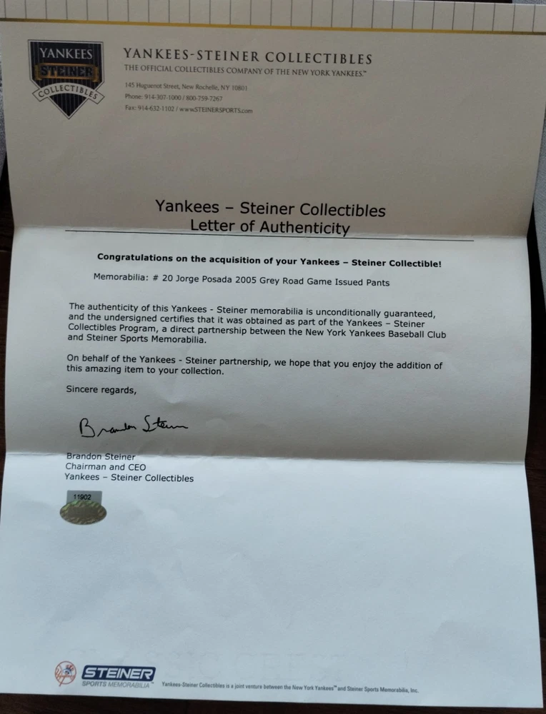 Own a piece of baseball history with these Jorge Posada Yankees 2005 Game Worn Road Pants. These pants are perfect for any die-hard Yankees fan who wants to show off their team spirit. They come with a certificate of authenticity.