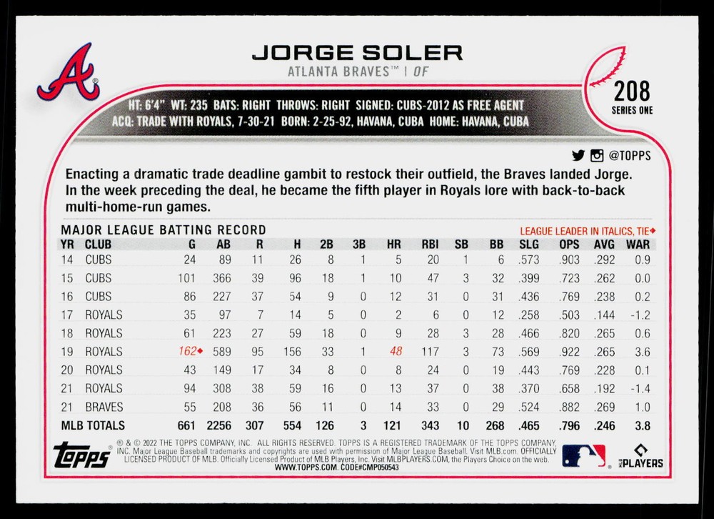 You will receive a , Jorge Soler 2022 Topps #208 Atlanta Braves Near Mint or Better condition. Please note i am not a professional card grader the condition of raw cards can be very subjective. Please refer to the high quality pictures to determine condition yourself any questions at all please feel free to ask!! we take pride in the quality of cards we sell and ship, all cards will be shipped in a penny sleeve and top loader for added protection. be sure to save us as a seller, as we are growing and listing daily THANK YOU FOR YOUR BUSINESS