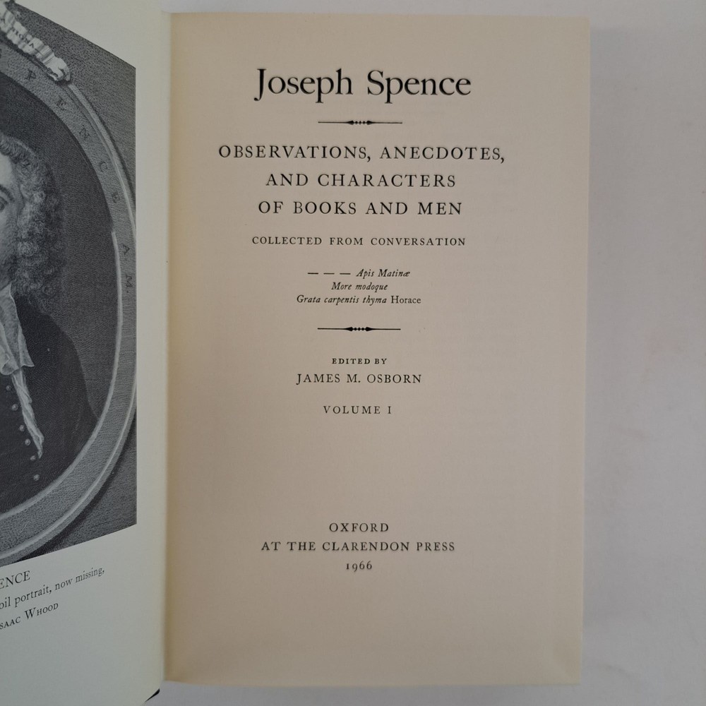 OBSERVATIONS, ANECDOTES, AND CHARACTERS OF BOOKS AND MEN COLLECTED FROM CONVERSATION [Two Volumes] Author: Spence, Joseph; Osborn, James M. [Editor] Title: OBSERVATIONS, ANECDOTES, AND CHARACTERS OF BOOKS AND MEN COLLECTED FROM CONVERSATION [Two Volumes] Publication: Oxford: Clarendon Press, 1966 Edition: First Edition Thus Description: Octavos, two volumes. In Very Good condition with Good dust jackets. Orange spines with black lettering. Jackets with moderate shelf wear, light plus creasing, and light plus chipping at edges, corners, and heads and tails of spines. Light shelf wear to surfaces of jackets. Very minor rubbing to lower edges of text blocks; a few scattered pencil annotations. Second volume with the bookplate of Ronald Paulson, leading expert on William Hogarth and former professor of English literature at Yale and Johns Hopkins. [Multivolume set. Additional postage necessary for expedited/international orders. Economy International shipping unavailable due to size/weight restrictions. For international/expedited customers, please inquire for rates.] Shelved in Room A. Seller ID: 1389648 Subject: Books on Books & Reference Welcome to the eBay store of Second Story Books! DC's Oldest Rare and Used Bookstore, Second Story Books operates two open shops in the Washington D.C. metropolitan area. We have an extensive internet presence and provide accredited appraisals member ASA. This listing was created by Bibliopolis.