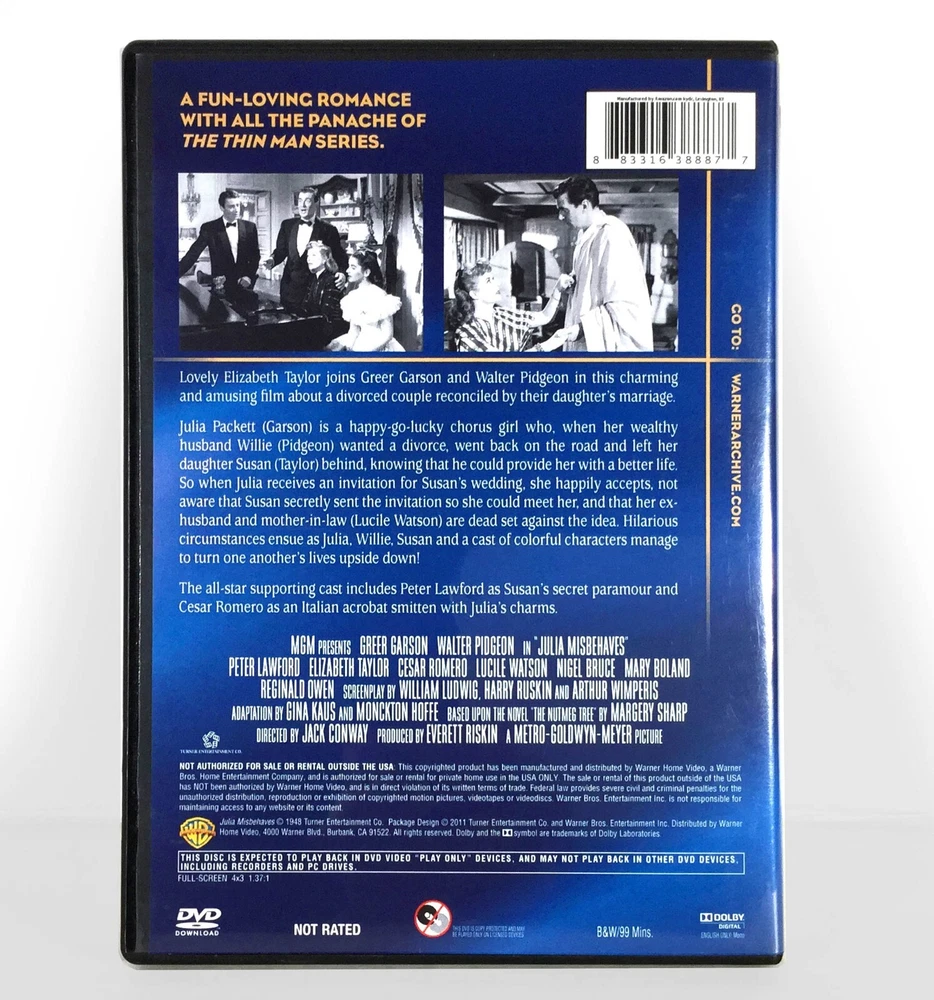 PLEASE READ INFORMATION & CAREFULLY REVIEW ALL PHOTOS ! Authentic, * Like New Condition DVD of "Julia Misbehaves - Full Screen "Warner Archives Collection" Edition (1948)" ! * The Disc Is A Made-On-Demand (M.O.D.) DVD-R Distributed By The Original Studio ! * The DVD Case May Have Some Minor Shelf Wear ! Sold "As- Is" ! Total Running Time Approximately 99 Minutes ! Starring Greer Garson, Walter Pidgeon, Mary Boland, Lucille Watson, Peter Lawford, Reginald Owen, Elizabeth Taylor, Nigel Bruce, Jack Conway & Cesar Romero! ( please carefully review all photos ) Please Take A Look At My Other Listings For Many Rare, NEW & USED DVD's & Blu-rays Including Vintage Collectibles, Toys & Hot Wheels ! I strive to ship very quickly, usually within 24 hours after payment is received (check my feedback). You will also automatically receive a tracking number for your package ! I package very carefully and use Bubble, Padded, Poly or Kraft Paper envelopes and will ship USPS Media Mail for most DVD' s & Blu-Rays. * Please Contact Me First Before Purchasing For Additional Cost For Extra Padding, Cardboard Protection And/ Or Shipping In A Box ! Sorry, but I do not ship internationally and ask that you please feel free to contact me with any questions!