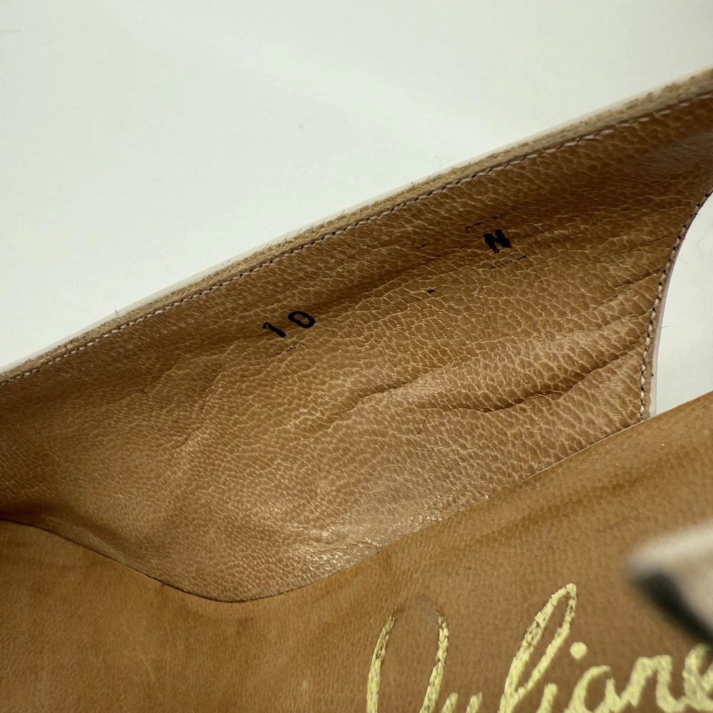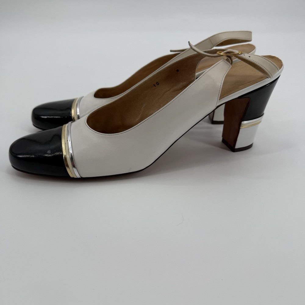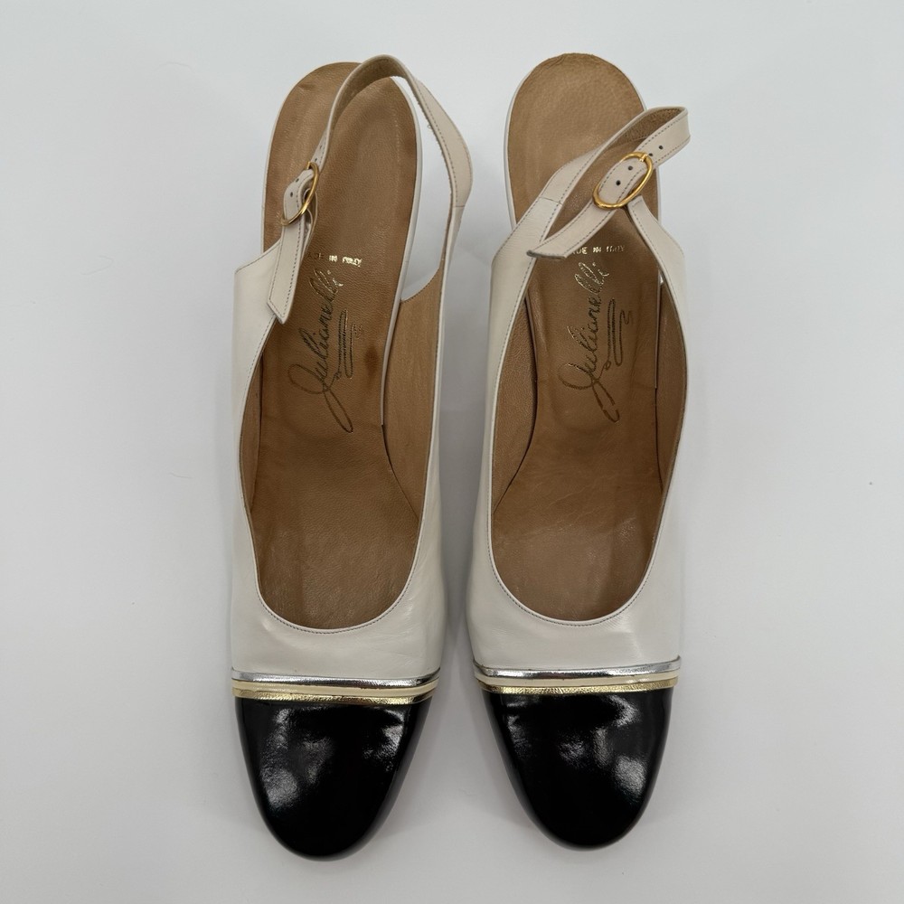 Great condition with minor signs of wear as pictured. The Julianelli Pretender Heels are a pair of vintage women's shoes from the 1950s, made in Italy. With a preppy look and a mix of white, black, and gold colors, these size 10 N heels are perfect for formal occasions. Crafted from leather, these original shoes exude a classic sophistication that is sure to make a statement. Ideal for those looking to add a touch of retro glamour to their ensemble, these heels are a timeless piece of fashion history.