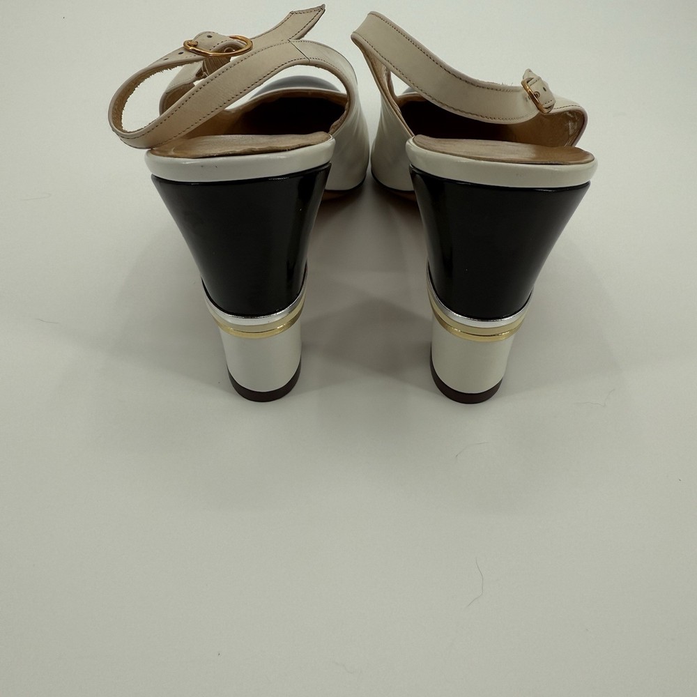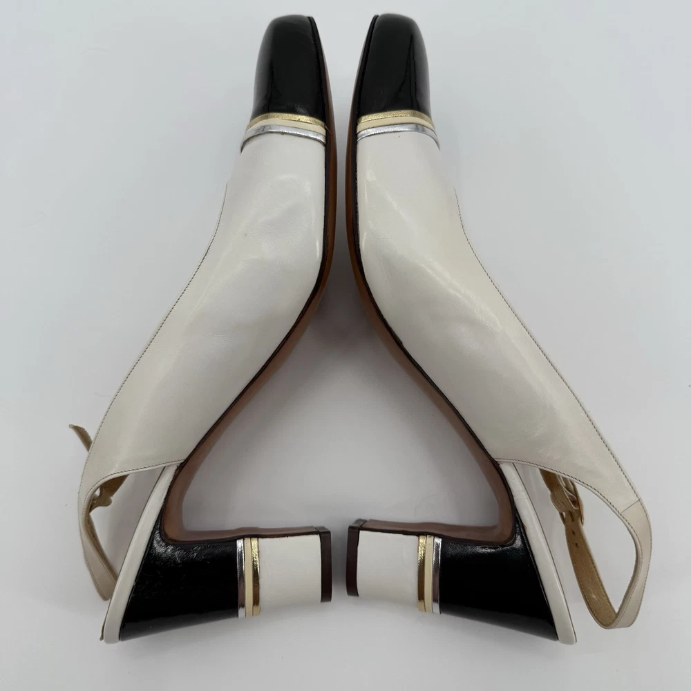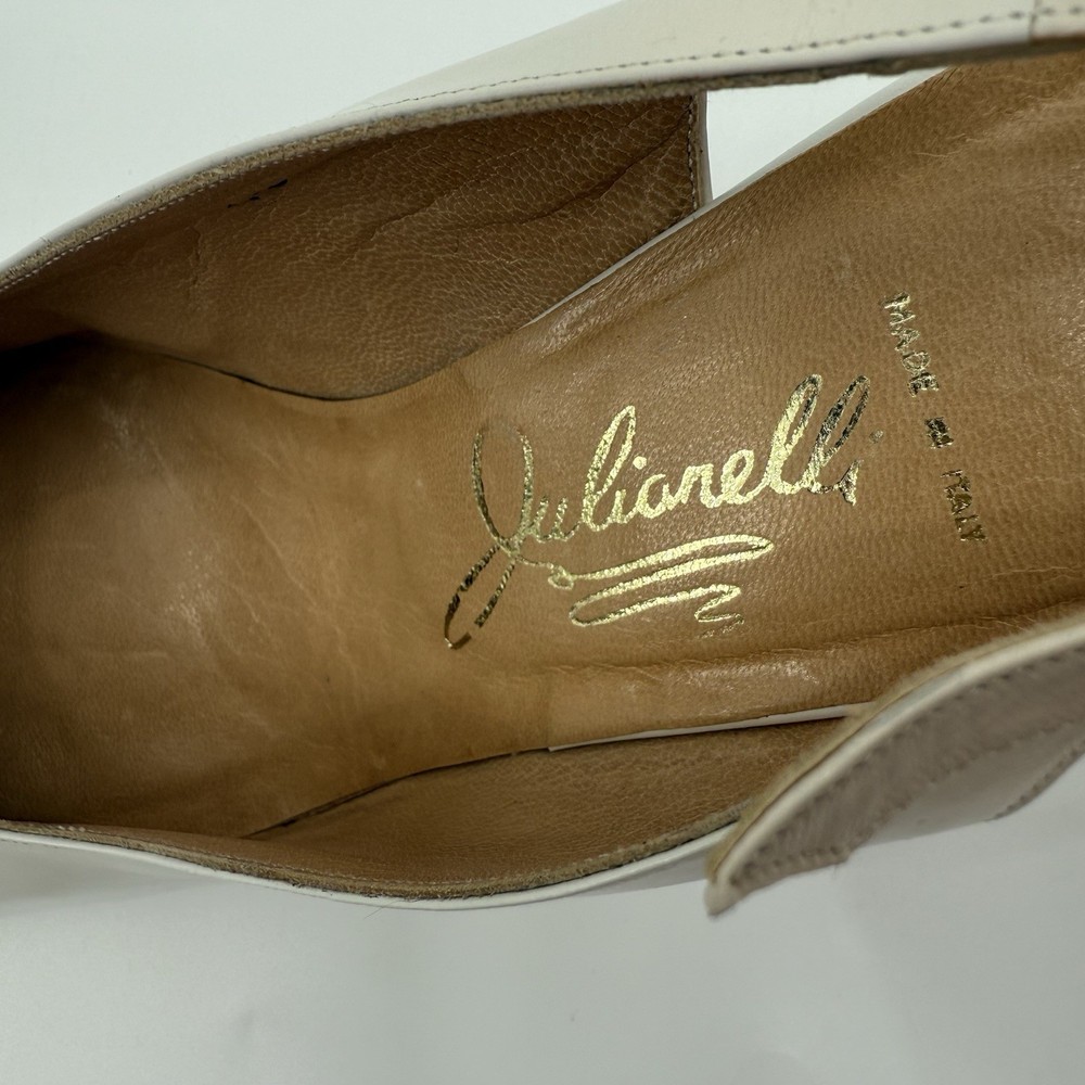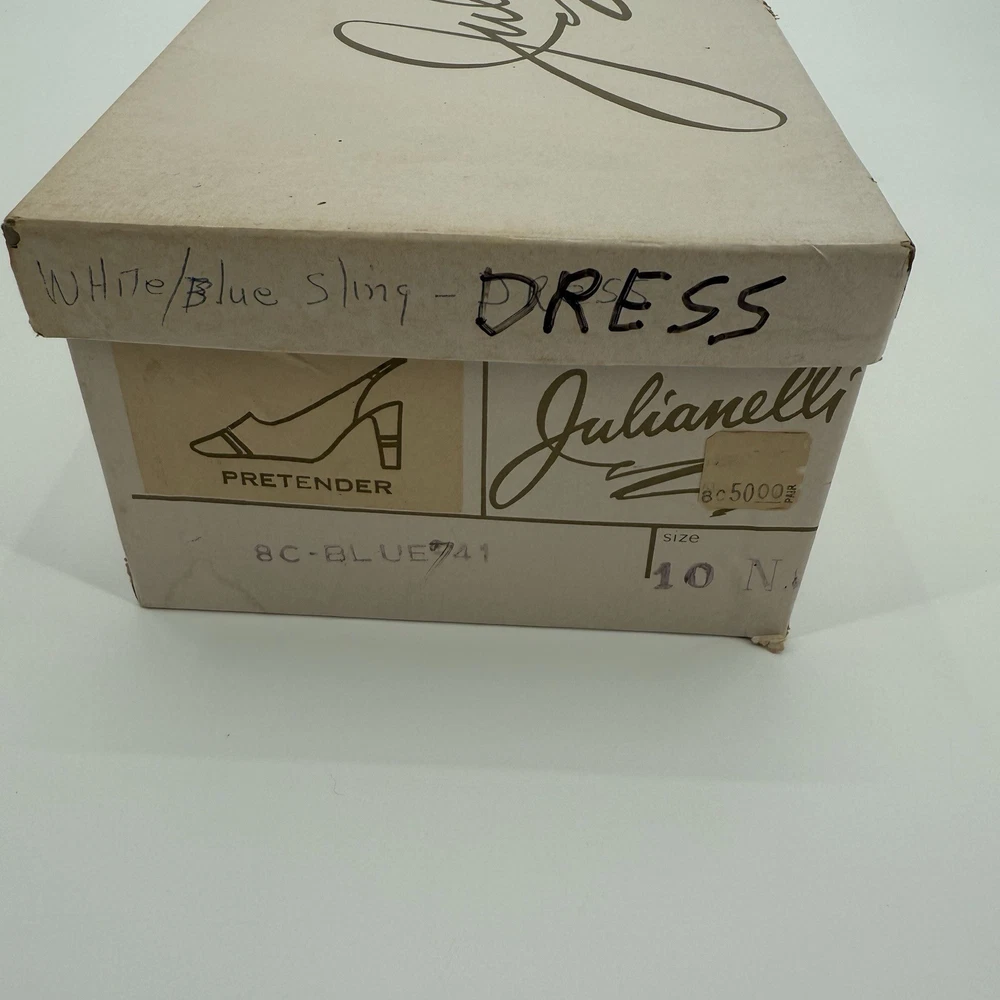 Great condition with minor signs of wear as pictured. The Julianelli Pretender Heels are a pair of vintage women's shoes from the 1950s, made in Italy. With a preppy look and a mix of white, black, and gold colors, these size 10 N heels are perfect for formal occasions. Crafted from leather, these original shoes exude a classic sophistication that is sure to make a statement. Ideal for those looking to add a touch of retro glamour to their ensemble, these heels are a timeless piece of fashion history.