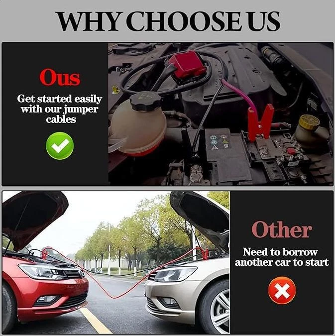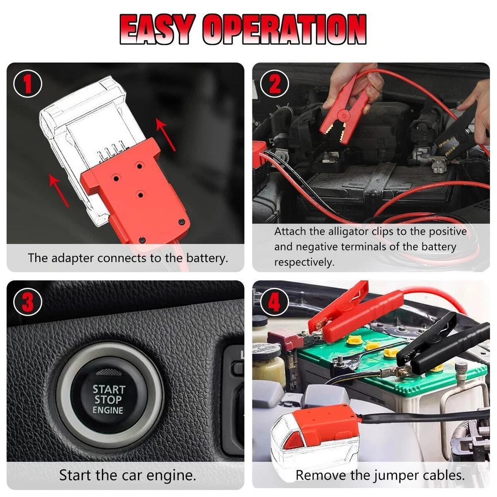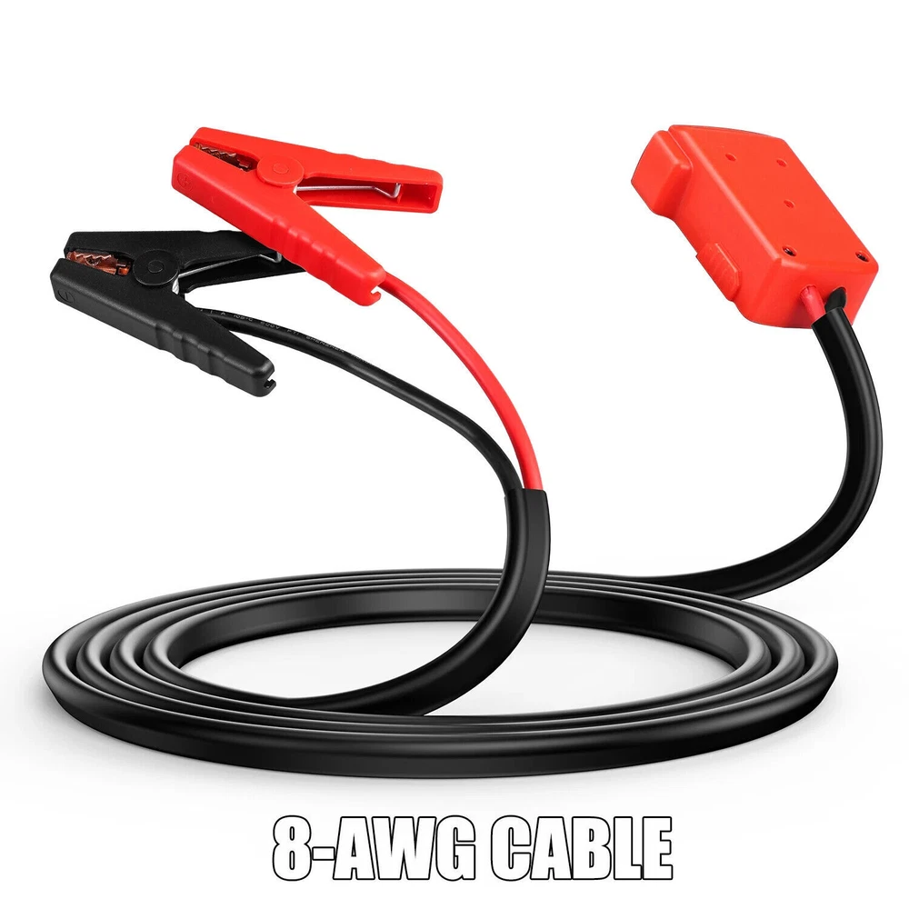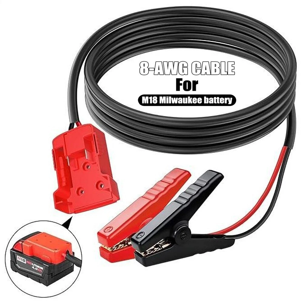 Features 1.Jump starter cable is exclusively designed for seamless compatibility with Milwaukee 18V Li-ion batteries. It's a breeze to use—simply align the power adapter into the groove, push the converter, and ensure it's locked onto the battery. (Battery not included) 2.adapter is crafted from tough ABS plastic, built to withstand the rigors of frequent use. The adapter itself is forged from pure cooper, enhancing both electrical conductivity and safety measures. The non-conducting rubber and dual-grip design ensure superior contact and secure tension. 3.Wire cable: 8AWG, Length: 6.39feet(Wire harness length: 5.9ft) how to use: 1.Connect the red battery clip of the jumper cable to the positive pole (+) of the vehicle and the black to the negative pole (-) 2.Plug the jumper into the jumper starter socket; 3.Start the car and disassemble Lower clamp. (Please follow the correct steps after reading the instructions for use). Safety Precautions: Do NOT reverse the operation sequence of the jump starter. Please be careful when using this product, this item can NOT be overloaded, check your device power before using, please. Do remove the product from the vehicle within 30 seconds after the vehicle is started, or it may cause security incidents. Note: Always check if your power bank is capable of supporting your car. KEEP IN MIND, the jump starter doesn’t convert voltage/ Step-down voltage! Package Included 1 * Line