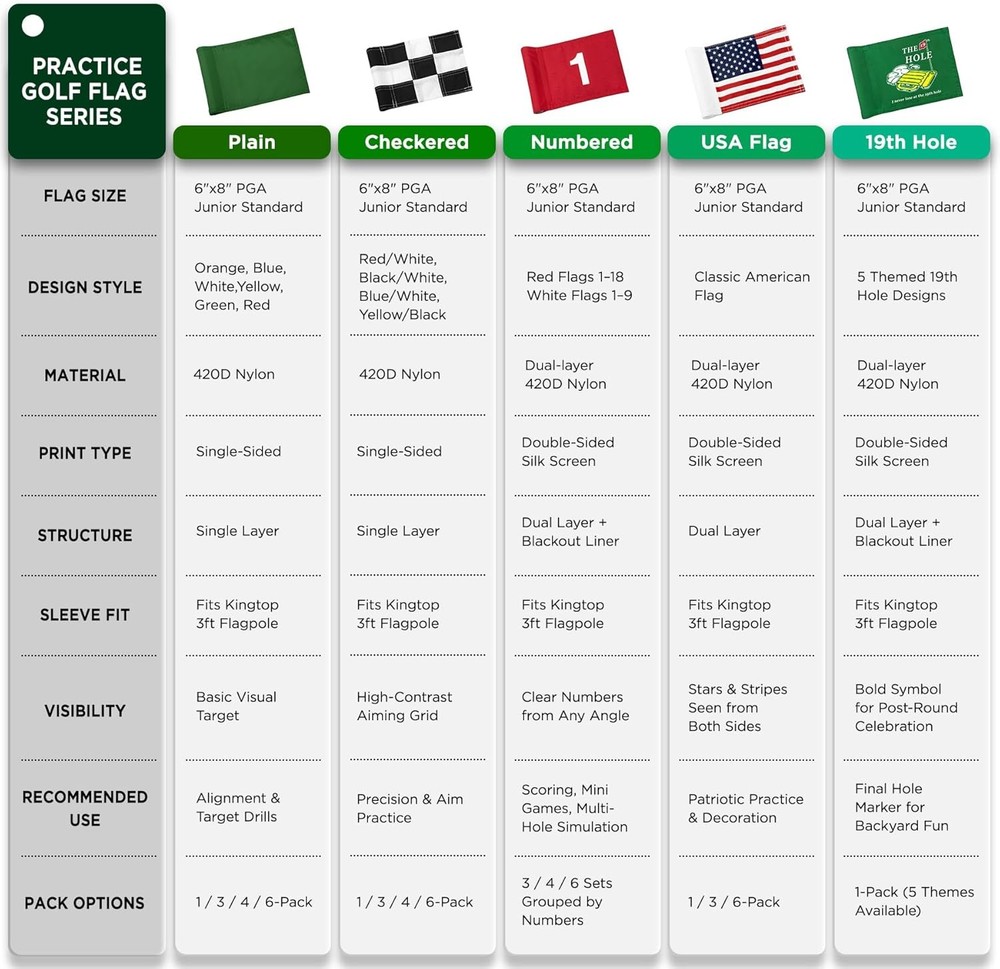 KINGTOP Solid Golf Flag All 8x6 Inch - 420D Nylon, Inch- Blank Green- 1pk Product Details Item Package Dimensions L x W x H: 6.5 x 3.5 x 0.05 inches Package Weight: 0.04 Kilograms Item Dimensions LxWxH: 8 x 6 x 0.01 inches Brand Name: KINGTOP Color: 8x6 Inch- Blank Green- 1pk Material: Nylon, Plastic, Polyester Manufacturer: KINGTOP Part Number: GA047-NL1 Theme: Sport Color: 8x6 Inch- Blank Green- 1pk Brand: KINGTOP Recommended Uses For Product: Outdoor Occasion: Cyber Monday Material: Nylon, Plastic, Polyester Special Feature: Lightweight Product Dimensions: 8"L x 6"W Fabric Type: 420D Nylon Product Care Instructions: Dry Clean Only 420D Nylon PGA Junior Standard Size: Specifically designed at 6" H x 8" L to fit 3-foot flagpoles, aligning perfectly with PGA junior flag standards. Vibrant Colors: Crafted from engineering-grade 420D nylon, ensuring vivid colors that resist fading even after outdoor prolonged exposure. Detailed Craftsmanship: Meticulously double-stitched to ensure edges don’t fray, offering robust longevity and consistent performance. Effortless Installation: Comes with a pre-sewn ABS sleeve on the left, fitting flagpoles within the diameter 3/8"< D <6/8", letting you set it up instantly. Perfect for Backyard Golfing: Elevate your backyard practice putting green! Available in an array of colors to match the backyard putting green, transforming your yard and creating memorable moments with friends and family.
