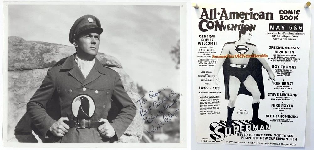 "BLACKHAWK" - KIRK ALYN SIGNED PHOTO LOT: 1 LOT w/2 items, 1 Vintage Signed Photo By KIRK ALYN, Mr. Alyn was the 1st Live-Action Movie "BLACKHAWK" & "SUPERMAN" - Lot includes 1 Original May 1978 Event Flyer w/Guest Kirk Alyn - Size: est. 7-7/8" x 10", Top & Left sides were Trimmed - Signed "In-Person" at a May 1978 Show held in Portland Oregon - Signed in Black, Photo is Inscribed "To Ron" - 1978 Event Flyer: 8-1/2" x 11", Nice, has some wear - includes My LOA - The items you see here are the items you will receive - SEE IMAGES - Very Good+ Condition: Nice, used, trimmed on top & left sides, has tack holes in corners, flat, clean, No main tears, No main creases, has wear, Has dings, dents, surface wear & or wrinkles, age yellowing, Event flyer is nice, Sold As-Is. SEE IMAGES & DESCRIPTION. KIRK ALYN SIGNED PHOTO, BLACKHAWK 1940s Movie SERIAL + 1978 Event Flyer SUPERMAN KIRK ALYN SIGNED PHOTO, BLACKHAWK 1940s Movie SERIAL + 1978 Event Flyer SUPERMAN Click images to enlarge Description "BLACKHAWK" - KIRK ALYN SIGNED PHOTO LOT: You are Bidding on 1 LOT with 2 items - 1 Original vintage Signed Photo By KIRK ALYN , Movie Actor & 1 Original 1978 Event Flyer - Mr. Alyn starred in the 1st Live-Action Movie Chapter Serials as "BLACKHAWK" & "SUPERMAN", inspired by the DC Comic Books - Lot includes 1 Original Vintage May 1978 Event Flyer which shows Special Guest Kirk Alyn, who was included in the 1977 "Superman" Movie with Christopher Reeves - Ready for Display! Size: est. 7-7/8" x 10", Top & Left side edges were Trimmed, B&W glossy photo (original size was 8"x10") - Has wear, Corners have tack holes - Signed "In-Person" at a 1978 Show held in Portland Oregon - Signed in Black Ink, Photo is Inscribed "To Ron, Best Always, "Blackhawk", Kirk Alyn" - May 1978 Event Flyer: is 8-1/2" x 11", Nice, has some wear, No tears, flat, clean, never folded - item includes My LOA, a Letter Of Authenticity - The items you see here are the items you will receive - SEE IMAGES for Sharpness & Defects . Very Good+ Condition: Nice, used, Photo is trimmed on top & left sides, Has tack holes in all corner areas, flat, clean, No main tears, No main image creases, has wear, Has corner & edge wear, Has dings, dents, surface wear & or wrinkles, May have some age yellowing, Event flyer is nice, Sold As-Is - Suitable for Framing - Any Questions Gladly Answered - a Nice Addition to Any Collection OR Give it as a Gift! NOTE: THIS is a Authentic Signed Item & NOT a Copy or Photo Reproduction! Payment USA BUYERS ONLY : Accepted Methods of Payment: Paypal.com, Visa, Mastercard, Discover, American Express, Google Pay (G Pay), and Other Ebay accepted forms of Payment. All items are Shipped Boxed, Fully Insured & Packed well to prevent damage in shipping. I am sorry we do not ship worldwide at this time, Please contact me for possible exceptions. All Questions Gladly Answered. Shipping All Items are sent with the US Postal Service, via USPS GROUND ADVANTAGE (formerly 1st Class Service), Fully Insured, with Delivery Confirmation. Always "GORILLA - PROOF" Packaging ... Every item is Bagged & Shipped Boxed for Protection Against damage during shipping. About Us In Business Since 1970 ... Selling Quality Vintage Collectibles on Ebay since 1997. See My Great Feedback of Happy Customers. Buy with Confidence! Contact Us E-mail Me Anytime with Your Detailed Want-List. Let me know & I can List items on Ebay for your viewing . I have a Huge Inventory of items for sale, Circa 1900-1985 that are Not online. Images sell! Get Supersized Images & Free Image Hosting Create your brand with Auctiva's Customizable Templates. Attention Sellers - Get Templates Image Hosting, Scheduling at Auctiva.com. Track Page Views With Auctiva's Counter