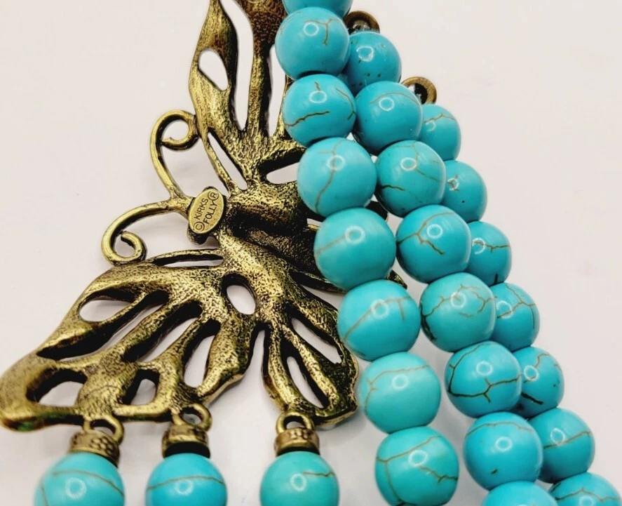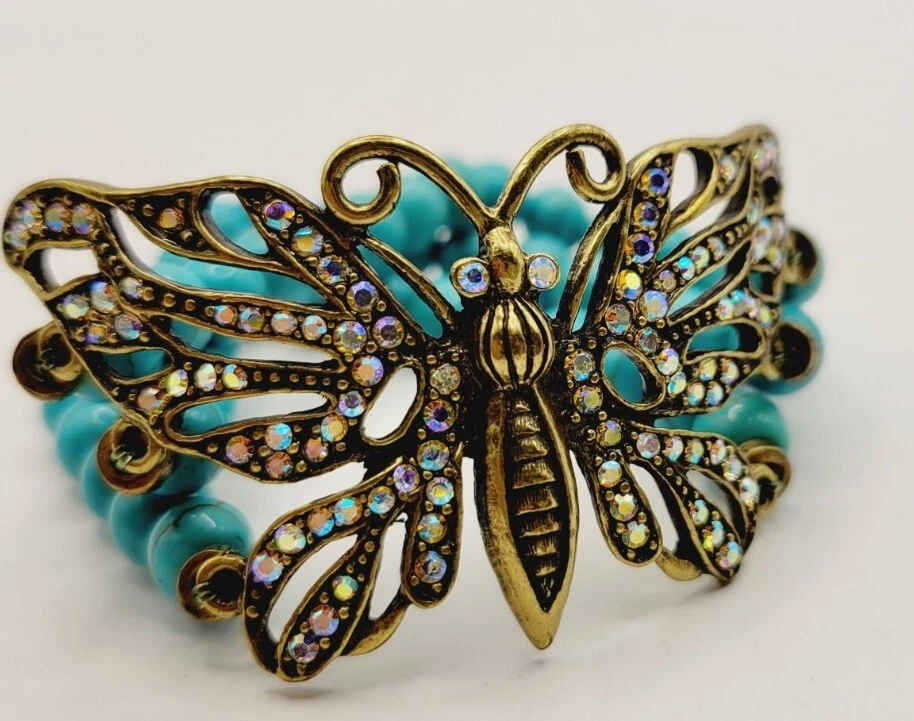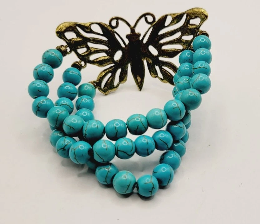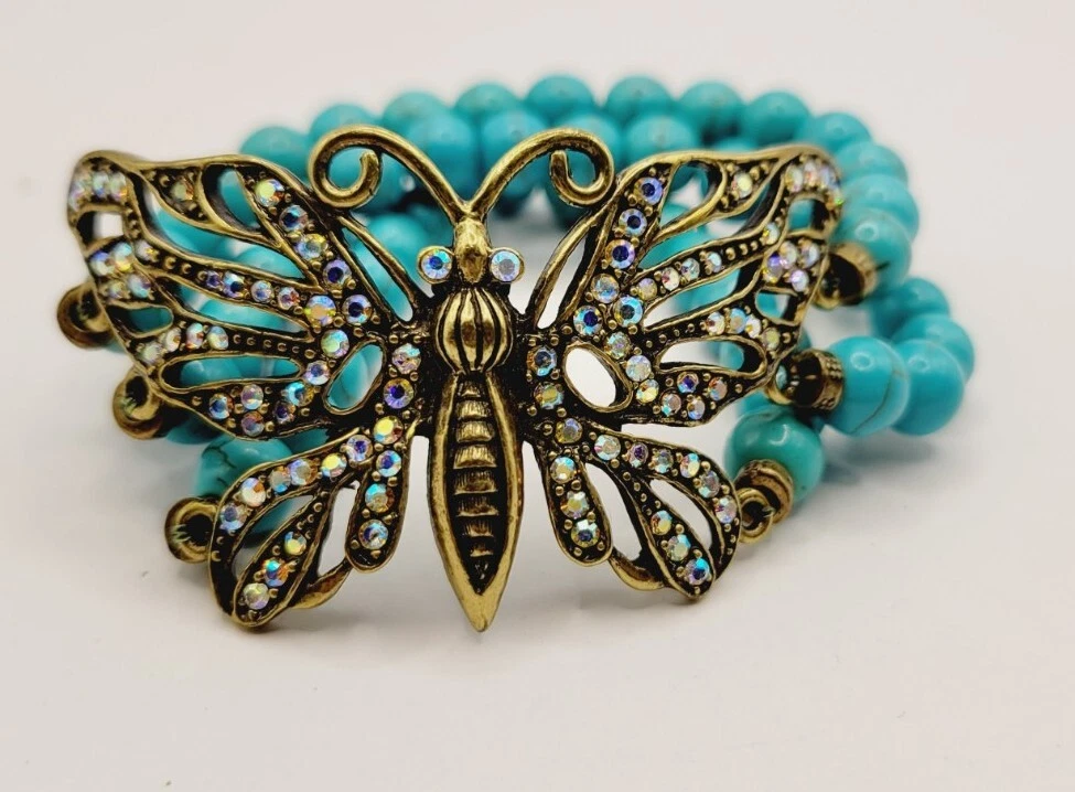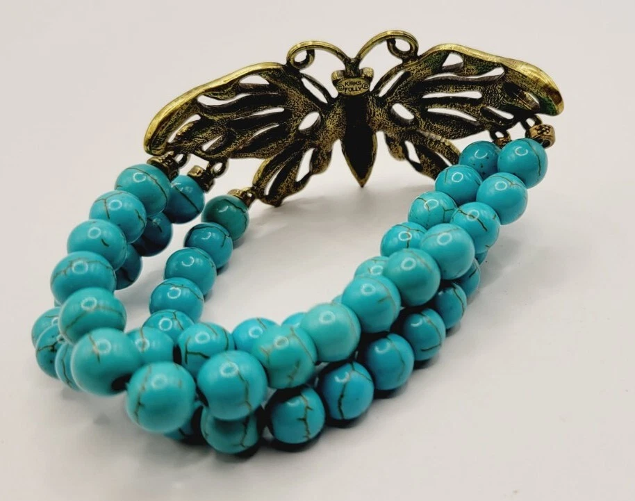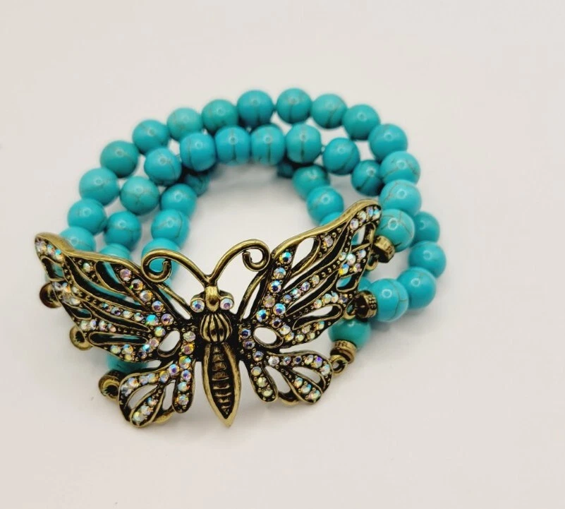 KIRKS FOLLY BUTTERFLY Stretch Bracelet Turquoise Layered Antique Gold tone