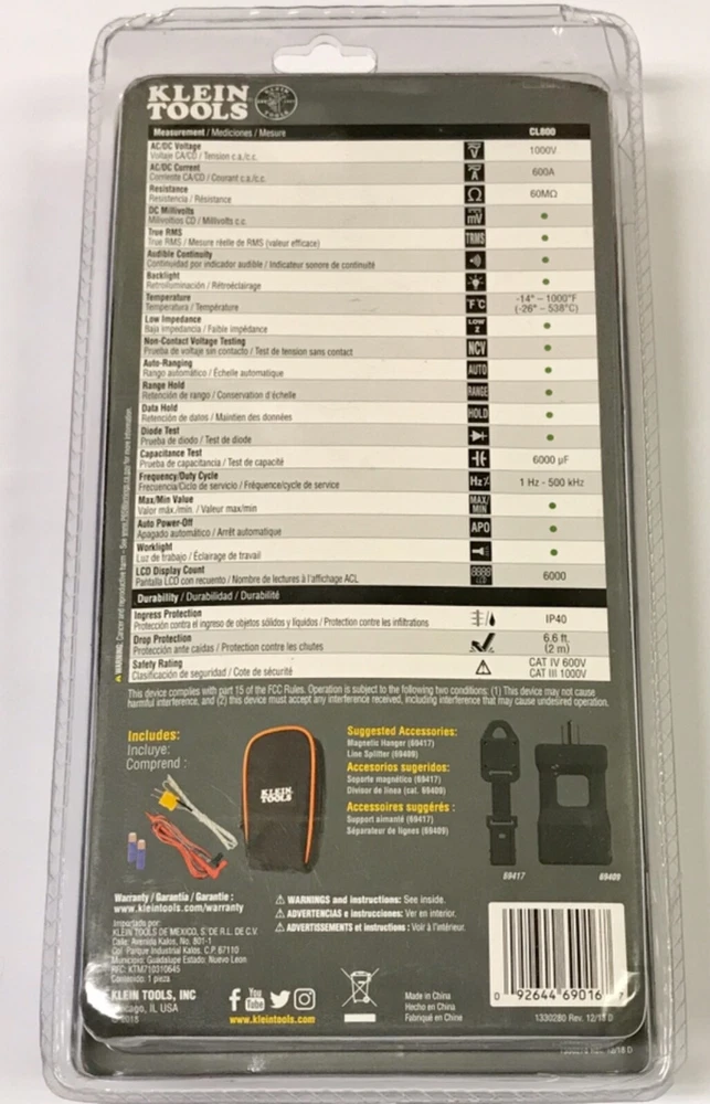 KLEIN TOOLS CL800 600 AMP AC DC Auto Ranging Digital Clamp Meter TRUE RMS w/ Carrying Case + Accessories