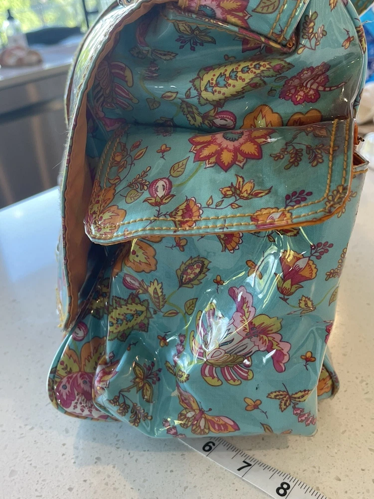 This Kalencom Laminated Diaper Buckle Bag is the perfect accessory for any parent on the go. With a beautiful turquoise and pink floral pattern, this unisex baby tote is both stylish and functional. Measuring 17.4x11.97x3.7 inches, it's large enough to hold all your baby's essentials and then some. Made in China, this designer baby diaper bag features a buckle closure and is lightweight at just 2.73 pounds. It's perfect for travel and can be personalized, although this is not required. The package dimensions are provided in the product description for your convenience. Get this must-have baby accessory today! Small smudge on end. From a smoke-free home.
