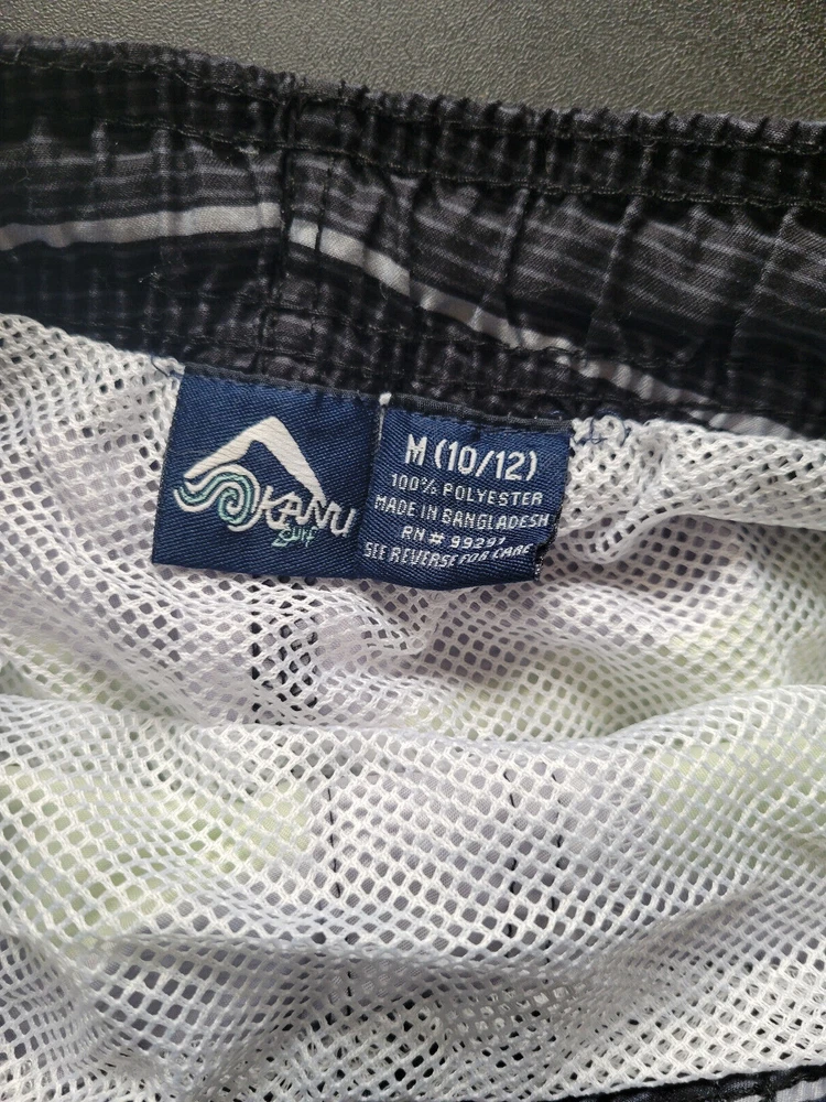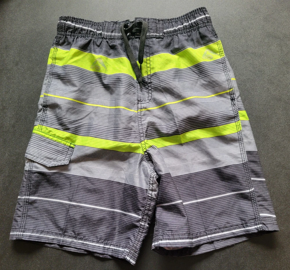 USA youth medium 10-12. Black, gray, and neon green horizontal stripes. Two slash/hip pockets and one velcro cargo pocket on the thigh. Mesh brief lining. Drawstring and elastic stretch waist. Decorated with logo. 100% polyester. Machine wash cold.