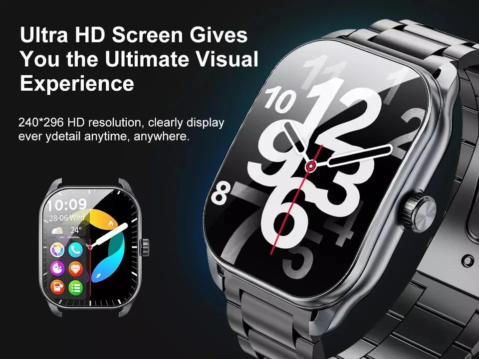 Introducing the Karchilor 2024 Smart Watch for Men, featuring a 2.01-inch curved screen and Bluetooth connectivity. This smartwatch is perfect for fitness enthusiasts and comes equipped with features like heart rate monitoring, sleep monitoring, and a passometer. The watch is also compatible with iOS and Android operating systems, and has a battery life of up to 7 days. The Karchilor Smart Watch is designed to be both stylish and functional, with a fine steel band and a square screen shape. It is waterproof up to a certain depth, making it suitable for use during outdoor activities. The watch also has a voice assistant built-in and can be controlled through multiple dials. Stay on top of your fitness goals with this Smart Bracelet, perfect for all compatible with iOS.