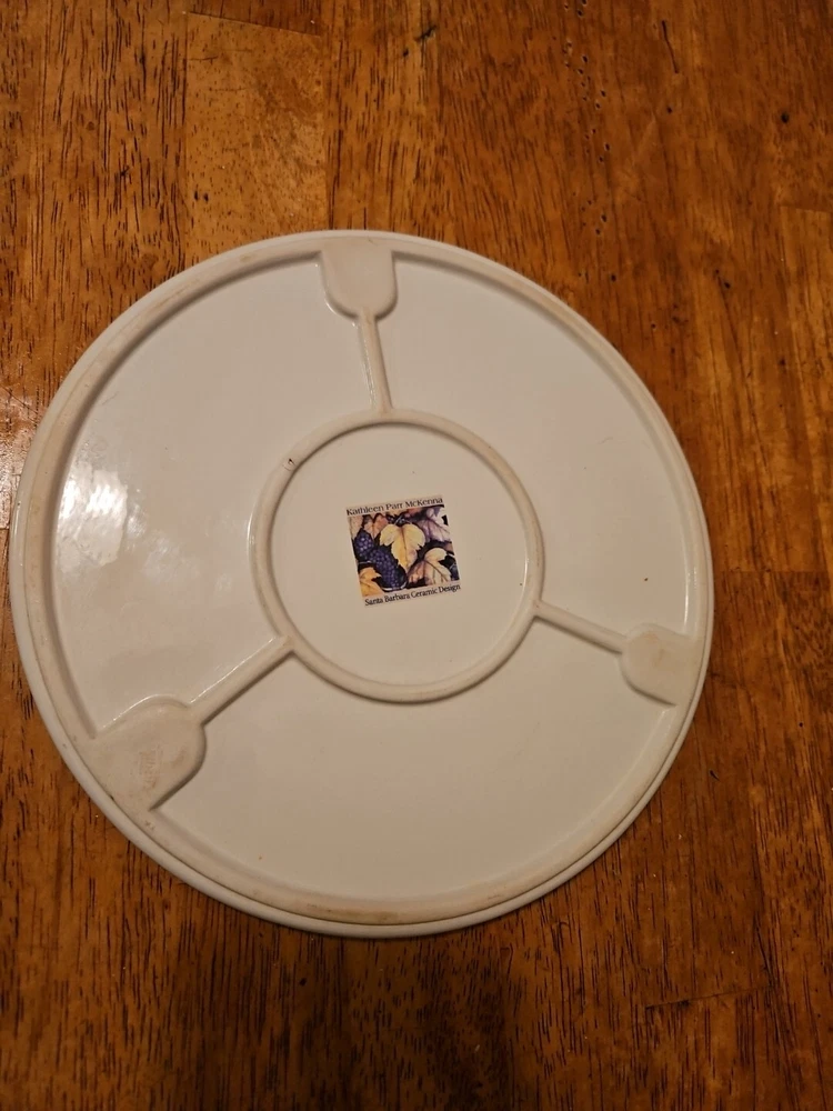 This beautiful Kathleen Parr McKenna porcelain cheese board is perfect for any wine and cheese lover. With a gorgeous multicolor design, this 9" round board is sure to impress your guests. Made by Santa Barbara Ceramic Designs, this cheese board features a unique wine and cheese pattern that is sure to make your dining experience special. Crafted using a mold making method, this porcelain cheese board is both durable and dishwasher safe. Measuring 9 inches in height, this board is perfect for serving a variety of cheeses and meats. Whether you're hosting a party or enjoying a snack, this cheese board is a must-have for any kitchen.
