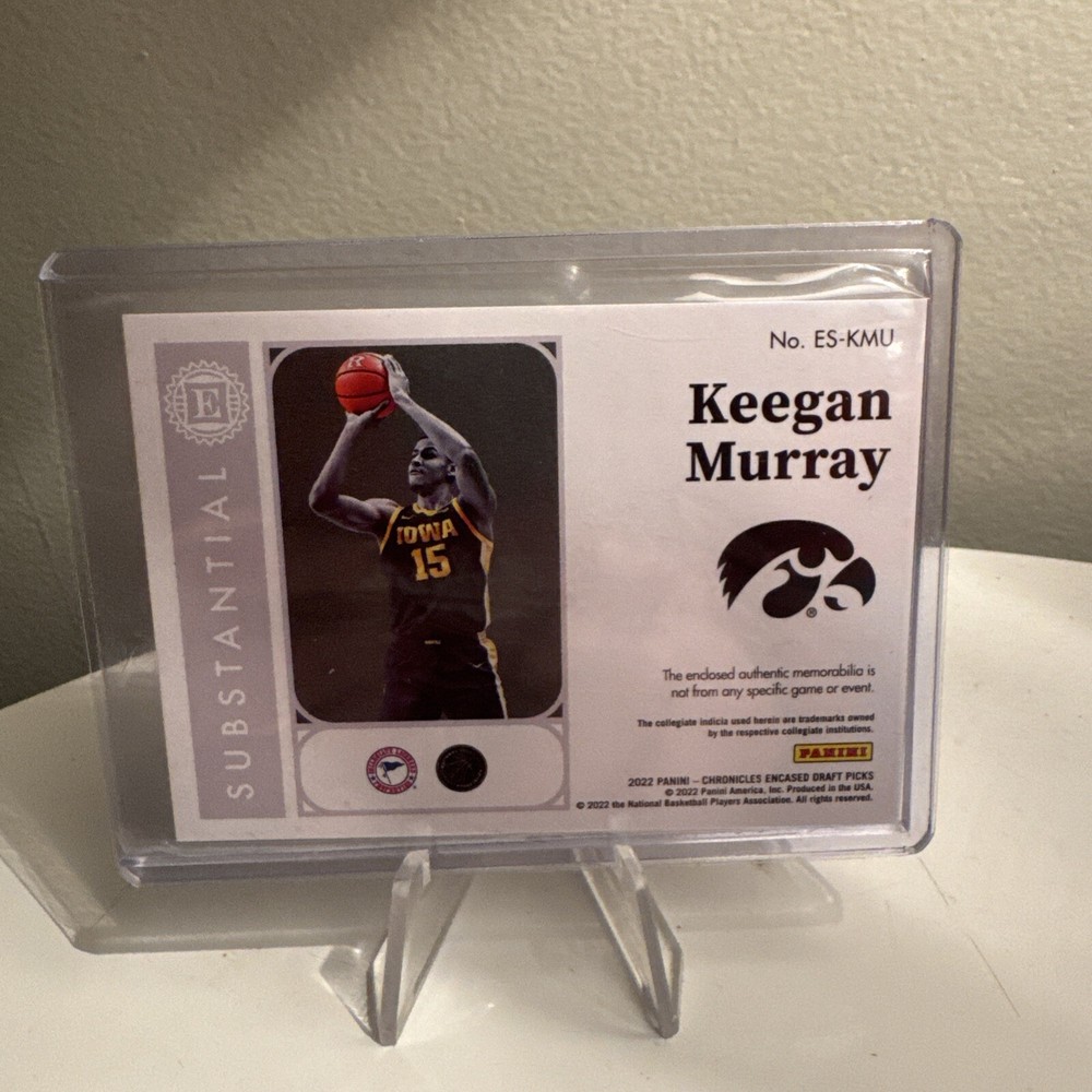 This is a 2022-23 Panini Chronicles Draft Picks sports trading card featuring Keegan Murray from the Iowa Hawkeyes basketball team. The card includes a patch with memorabilia from the player. It is in very good condition and is ungraded. The card is not autographed and is part of a parallel/variety set by Panini for the NCAA.