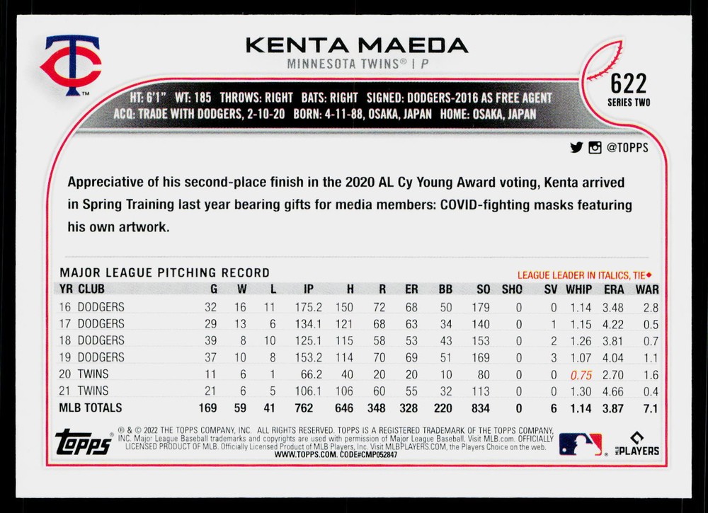 You will receive a , Kenta Maeda 2022 Topps #622 Minnesota Twins Near Mint or Better condition. Please note i am not a professional card grader the condition of raw cards can be very subjective. Please refer to the high quality pictures to determine condition yourself any questions at all please feel free to ask!! we take pride in the quality of cards we sell and ship, all cards will be shipped in a penny sleeve and top loader for added protection. be sure to save us as a seller, as we are growing and listing daily THANK YOU FOR YOUR BUSINESS