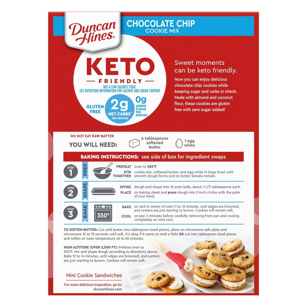 Keto-friendly Chocolate Chip Cookie Mix makes delicious chocolate chip cookies that fit your lifestyle. This mix makes it easy to bake delicious keto cookies. Made with almond flour, coconut flour, and real chocolate, this keto cookie mix is your no-compromise sweet choice. Simply add water and butter to the baking mix and prepare as directed. Prepare gluten-free chocolate chip cookies as a special keto dessert or as a delicious keto snack. These gluten-free desserts let you feel good about the baked goods you serve. 8.8 oz box of Keto-friendly Chocolate Chip Cookie Mix. Easy-to-make chocolate chip cookie mix for keto snacks and gluten-free desserts that meet your dietary needs without compromise. Each package of this keto cookie mix makes 10 cookies, perfect for sharing with family or friends and for special events. Simply add water and butter to the keto cookie mix to create a bakeable cookie dough in minutes.
