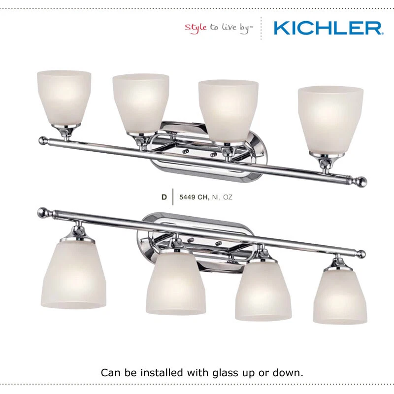 Powered by Frooition All Categories Kichler 5449 Ansonia 4 Light 31" Wide Vanity Light Bathroom Fixture with Etched Glass Shades Overview Item Description Linear and futuristic in its design, the Ansonia Collection takes simple, striking shapes to form a line of fixtures that are both delicate and ultramodern. Each piece features a clean profile with an uncluttered design suitable for any home. Features: Satin etched glass gently softens and diffuses the light. Reversible Mounting - May be installed with the glass pointed upward or downwards Covered under Kichler's 1-year limited warranty This transitional vanity lighting fixture from the Ansonia collection is available in brushed nickel, chrome, and olde bronze finishes Complete the look of your bathroom with these other items from the Ansonia Collection - see Related Items Dimensions: Height: 8.75" Width: 31.25" (measured from furthest point left to furthest point right on fixture) Product Weight: 7.1 lbs Electrical Specifications: Bulb Base: Medium (E26) Bulb Shape: A19 Number of Bulbs: 4 Bulb Included: No Watts Per Bulb: 100 Maximum Wattage: 400 watts Voltage: 120 (U.S. standard line voltage) Why Choose BuildInc? OUR PROMISE TO YOU About Us At Build, we promise to provide the best selection we can, most competitive pricing, and unmatched customer service. Our store has quality home improvement products from trusted manufacturers like Moen, American Standard, Delta, Kraus, Kichler, Progress Lighting, Schlage, Kwikset, Baldwin, Broan, NuTone, Air King, and Rev-A-Shelf. With over 200,000 home improvement products for you to choose from, we have just what you need to get your project done. Fast & Free Shipping We promise to make it our priority to get you your items as fast as we can. We ship from 440 warehouses around the country, ensuring that your product will get to you as soon as possible. We know you're eager to get your hands on your new purchase, we would be too. As a bonus, most items ship for free. Returns We are happy to accept returns of unused or defective items for a refund within 30 days from the date of delivery. For returns outside 30 days, please contact our Customer Service team to go over our options. For full details, please view the Shipping and Payments tab above. To initiate a return simply go to the eBay Returns Portal and submit a return request. We ask that all items be returned with all original components via a traceable method. Once your return is received and processed, we will quickly get your refund or replacement issued. If for any reason you are unsatisfied with your purchase or for product or warranty questions, please contact Customer Service team for assistance. More Items! View more great items! About Us | Shipping | Returns | Contact Us | FAQ | Collections | Special Offers! Powered by Frooition Frooition Frooition | No-js Template | eBay design, eBay store design, eBay shop design, eBay template design, eBay listing design (ver:froo_no_js) This listing is currently undergoing maintenance, we apologize for any inconvenience caused.
