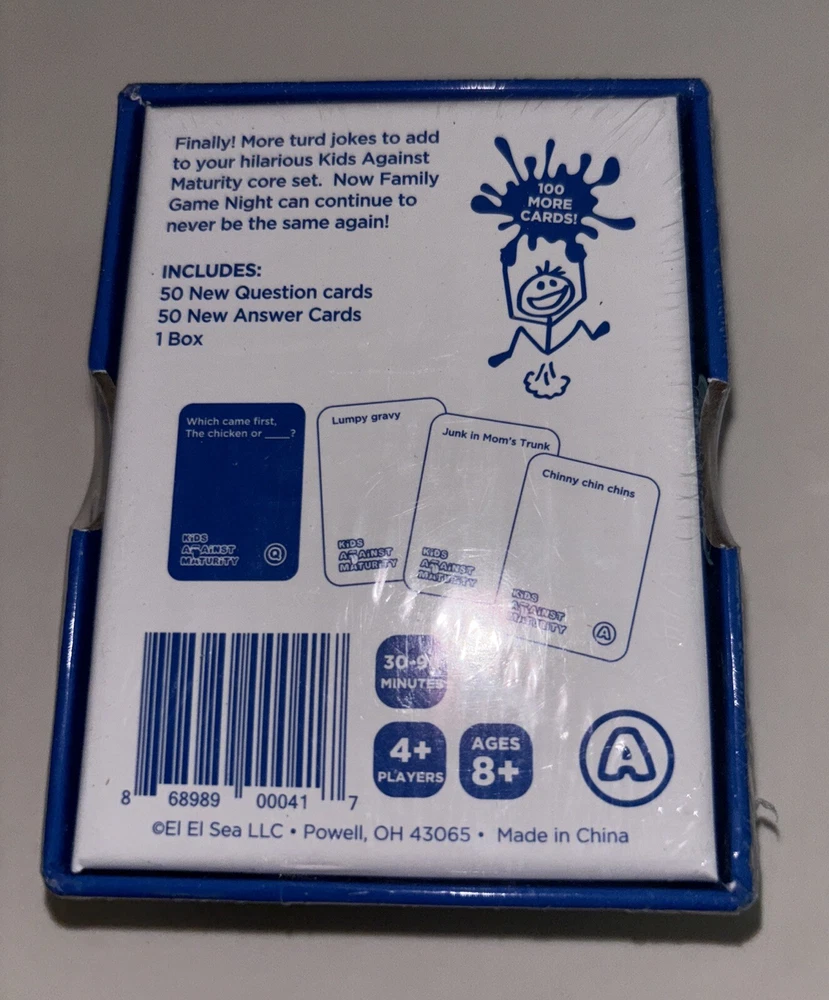 Get ready for endless hours of fun with the Kids Against Maturity Expansion Pack #1! This card game is perfect for kids and families who want to test their matureness. With a minimum of 4 players, this game is great for both boys and girls aged 8 and above. The game includes cards with various challenges and categories, such as "Sneaky", "Gross", and "Wacky". Players must complete challenges and categories to earn points. The game is easy to learn and perfect for family game night. It has even won the Golden Geek Award! So, get your family and friends together for a night of laughter and fun with Kids Against Maturity Expansion Pack #1.
