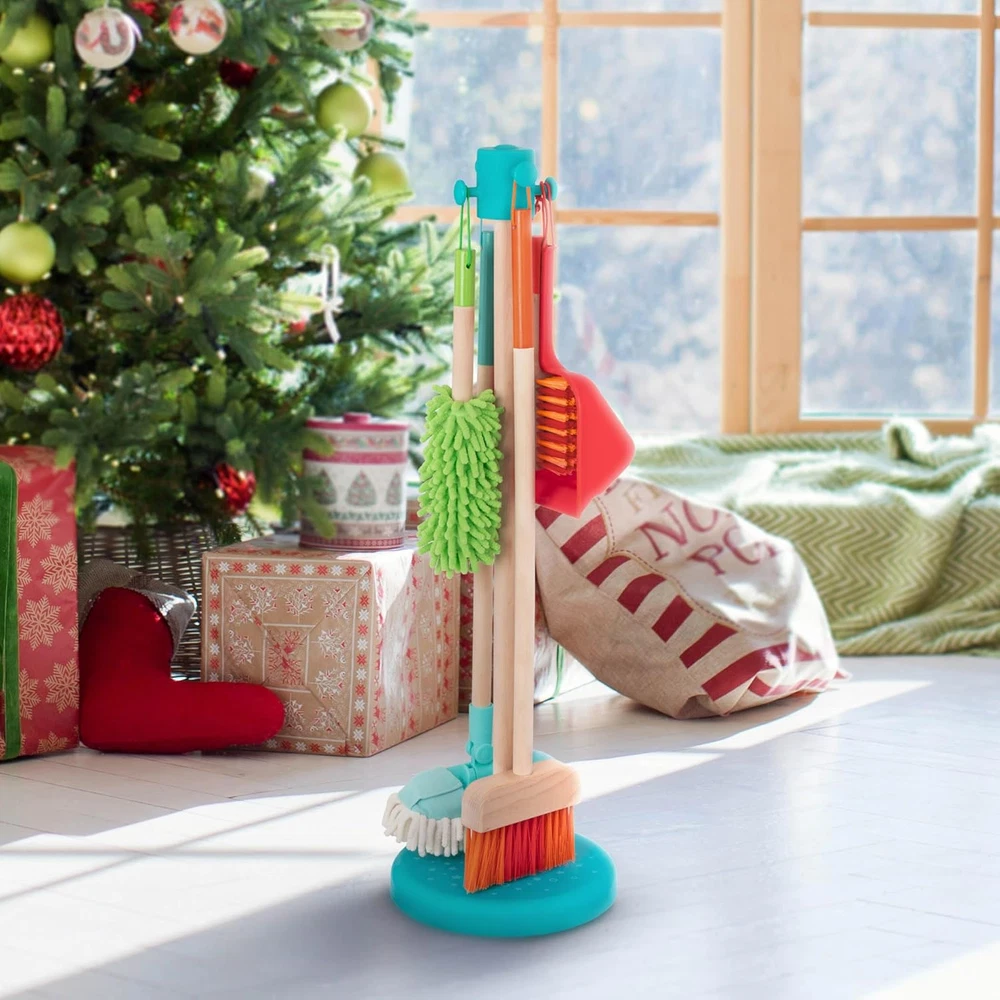 Pretend Play Set: Clean the days away—this cleaning set for kids has tons of realistic details for hours of imaginative pretend play. 5 Cleaning Toys: With a toy broom, mop, brush, duster, and dustpan, your kiddo can lend a helping hand. Developmental Benefits: Playing with this cleaning set can improve motor skills and hand-eye coordination. Storage Included: This playset comes with a storage stand for keeping all the cleaning toys neat n’ tidy. Age Recommendation: This toy cleaning set is recommended for kids 2 years +. Beautiful cleaning set to keep your little one busy! This colorful and kid-friendly set comes with hours of pretend play opportunities and it can also help your child develop a sense of responsibility as they clean and play.