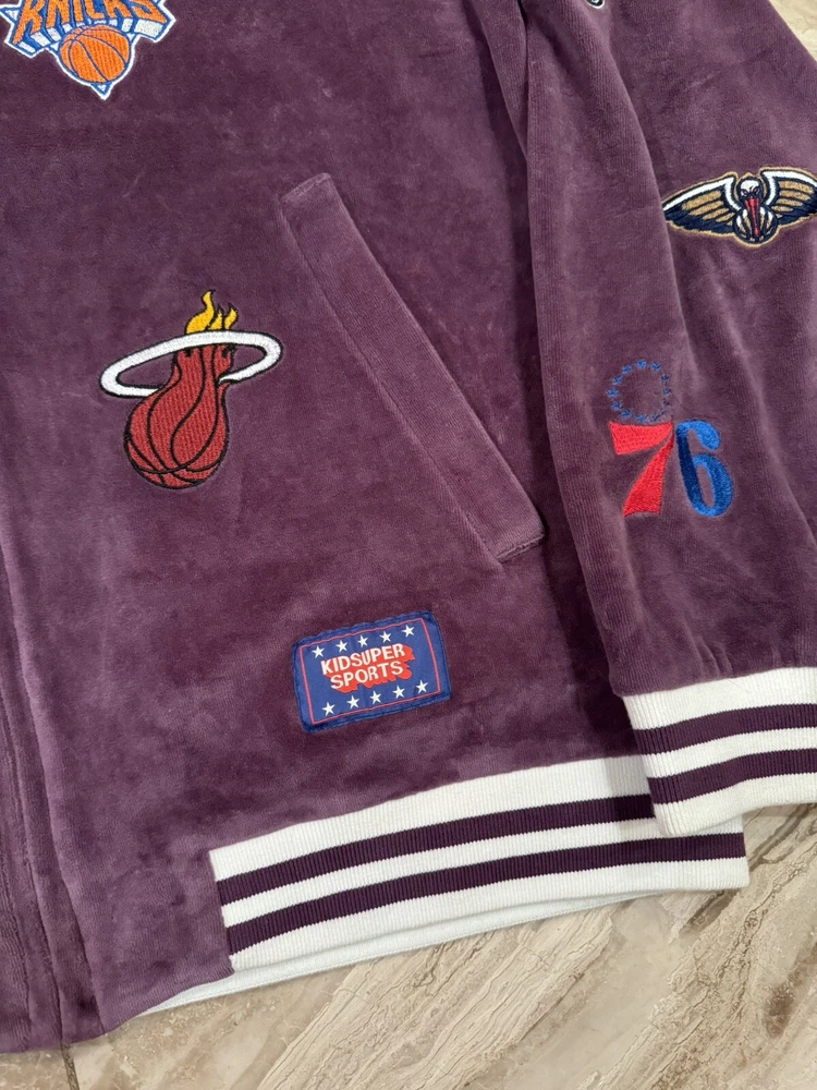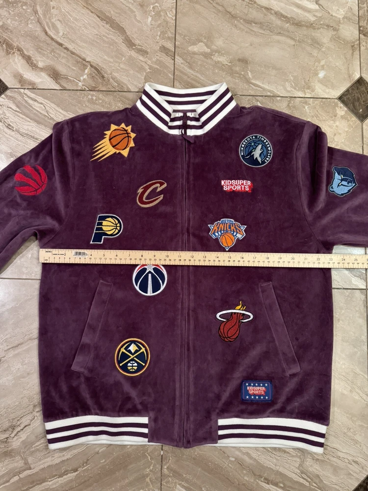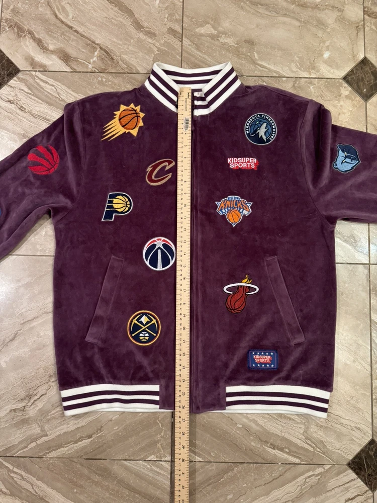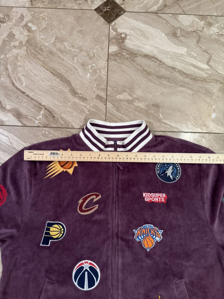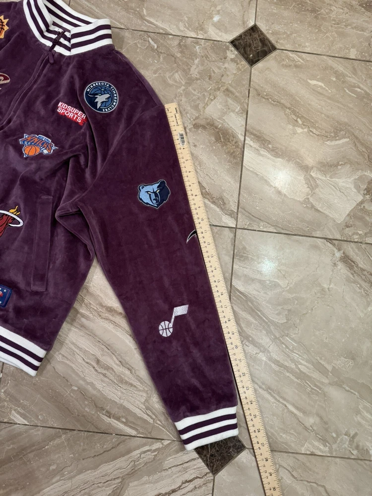 Kidsuper Studios NBA Jacket Size Large Embroidered Team Patches Measurements are in photos but also listed below. Please note that measurements may slightly vary depending on how the jacket is laid out. Measurements: Pit to pit: about 23 inches Length: about 26.5 inches Shoulders: about 19.5 inches Outer sleeve length: about 26 inches Please see all photos to judge condition. Jacket is in overall very good pre owned condition. Very cool velour purple color and high quality NBA team patches.
