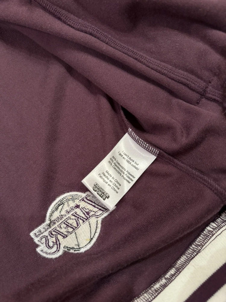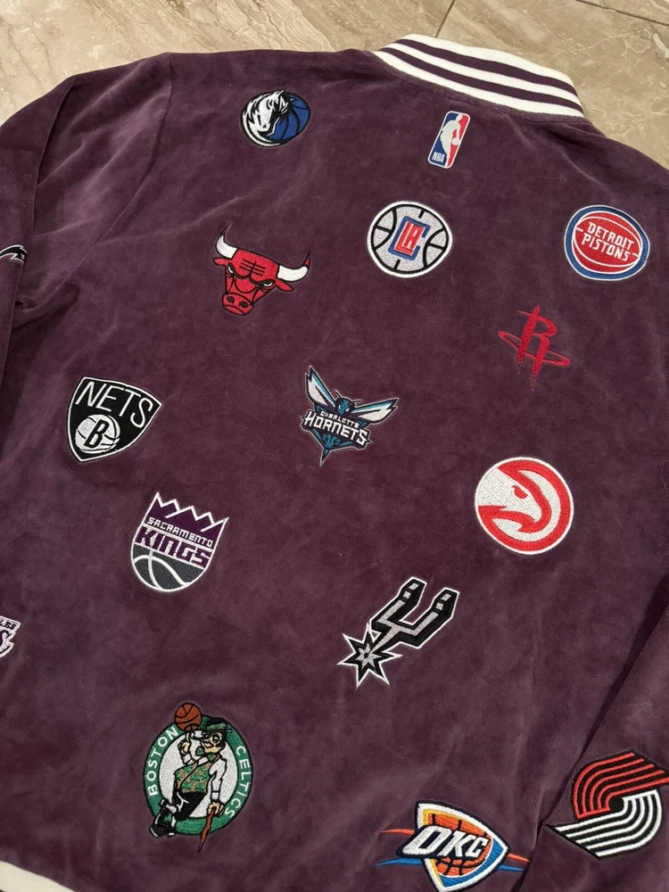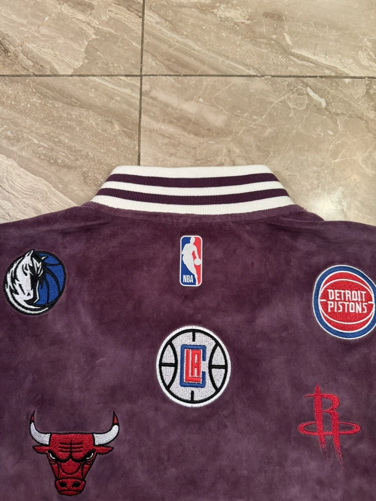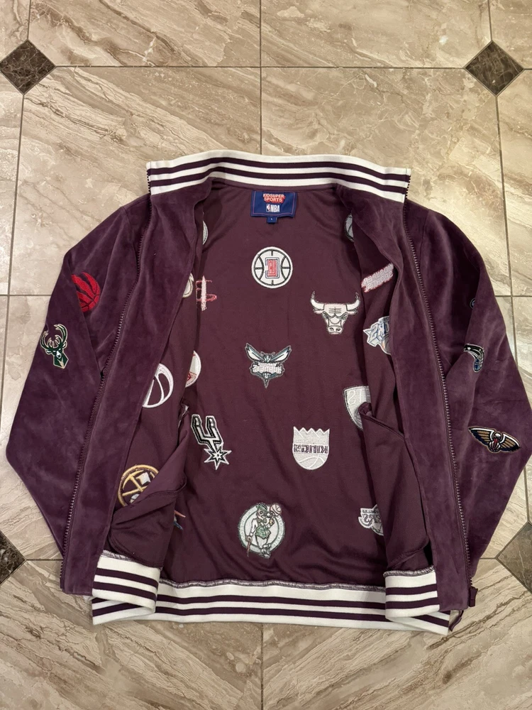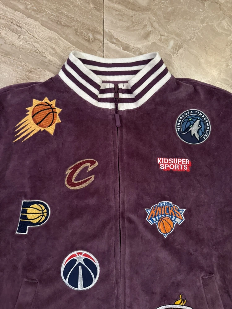 Kidsuper Studios NBA Jacket Size Large Embroidered Team Patches Measurements are in photos but also listed below. Please note that measurements may slightly vary depending on how the jacket is laid out. Measurements: Pit to pit: about 23 inches Length: about 26.5 inches Shoulders: about 19.5 inches Outer sleeve length: about 26 inches Please see all photos to judge condition. Jacket is in overall very good pre owned condition. Very cool velour purple color and high quality NBA team patches.