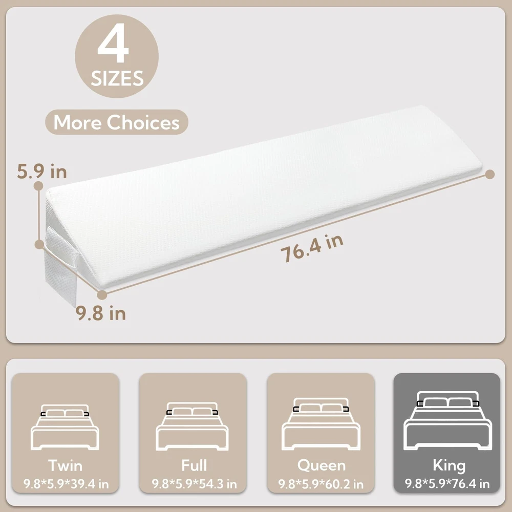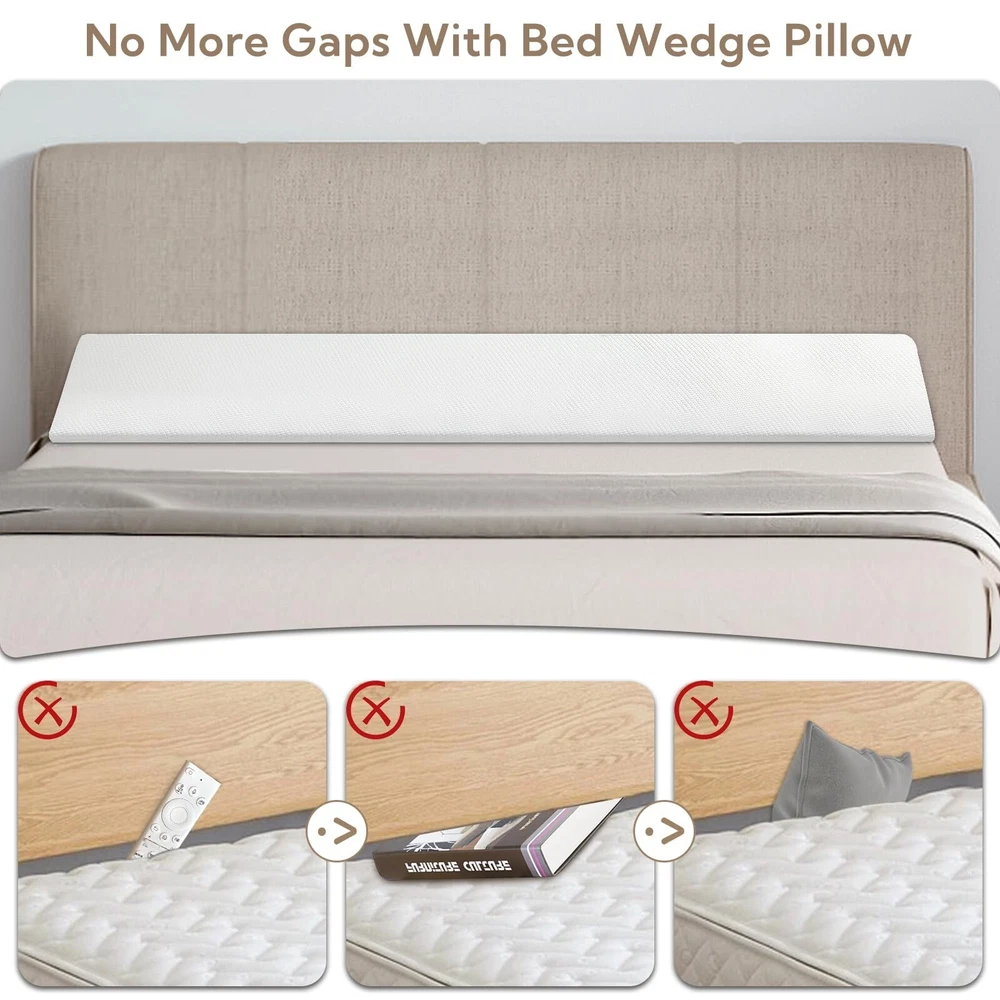 King Bed Wedge Pillow - Versatile Wedge Pillow Bed Gap Filler. Can Also be Used as a headboard Pillow, Mattress Wedge, and Bed Gap Filler (White 76"x10"x6") Product Details Color: White Size: King Brand: AAAini MPN: Does not apply UPC: Does not apply EAN: Does not apply Brand: AAAini Special Feature: Bagged Color: White Size: King Fill Material: Memory Foam Brand: AAAini Special Feature: Bagged Color: White Size: King Fill Material: Memory Foam Shape: Wedge Age Range (Description): Adult Recommended Uses For Product: NO Use for: Whole Body Material: Air-layer Fabric Material Product Care Instructions: Machine Wash Number of Pieces: 1 Pattern: Solid Manufacturer: AAAini Product Dimensions: 76"L x 10"W Unit Count: 1.0 Count Item Weight: 4.4 pounds Country of Origin: China Date First Available: January 11, 2024 Versatile Gap-Filling Design: Our pillow not only closes the gap between the headboard and mattress, preventing items and pillows from falling off the bed, but it is also tailored for gaps from 0 to 5.5 inches. Offering a secure solution, it eliminates worries about losing items. Experience stable support with our high-density foamyour pillow stays in place while you sleep. Choose from various lengths to find the perfect fit for the width of your bed. The triangular design not only fills gaps at various angles but also supports your head and neck for a more comfortable sleep, reducing the need for multiple pillows in your bed. Large Capacity Pocket Storage Design: Beyond its gap-filling function, our pillow boasts two spacious pockets on both sides. Easily store items like phones, remote controls, glasses, and more, keeping your resting space tidy and organized. Removable and Machine-Washable Cover: Our pillow features a removable, machine-washable cover for easy cleaning and hygiene maintenance. Regular washing helps remove stains and odors, ensuring the pillow stays fresh and sanitary.