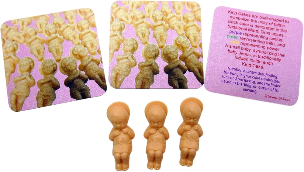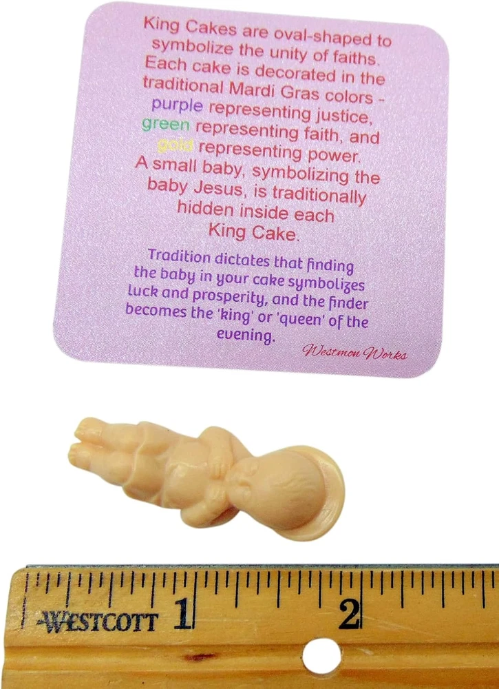 Store New Arrivals Add to Favorite View Feedback Contact Fast deliveries to the customer's home Quality customer service John Make the customers happy! King Cake Babies Pack for Mardi Gras with Baby Jesus Figurines with Story Cards, Set of 3 Description Each order has 3 of the same Baby Jesus Includes 3 cards that tell the story of the King Cake Perfect set for bakers to use for decorating Figurine material: Plastic DO NOT bake with the figurine inside. Figurine must be added after Product Description Discover the Magic of Mardi Gras with Westmon Works King Cake Babies! Celebrate this festive season with a cherished tradition! Westmon Works King Cake Babies are the perfect addition to your Mardi Gras celebration, bringing a dash of excitement and a taste of New Orleans right to your doorstep. Our extensive collection of King Cake Babies sets is a must-have for any Mardi Gras event. King Cakes King cakes are a sweet symbol of Epiphany, a Christian feast day in January that celebrates the visit of the Magi (the Three Kings or Three Wise Men you might recognize from Christmas nativity scenes) to the Christ Child. This feast day marks the close of the Christmas season as well as the beginning of Carnival, which lasts through Mardi Gras (Fat Tuesday), the day before Ash Wednesday and the start of Lent. The cake is baked in a ring or circular shape to represent a King's crown. This Baby Jesus pack is perfect for adding to your Kings Cake. King Cake Single Baby An easy gift for anyone from the big easy. 3 Pack of Babies We have a 3 pack set of King Cake Babies with cards for each one. Bulk Pack of King Cake Westmon Works also offers a bulk pack of 50 babies! Perfect for bakeries. Small American Family Business Our items are designed and packed by hand in the USA by a small family business in Michigan. Laissez les bons temps rouler! Unit Count 3 Count Product Dimensions 1"W x 1"H Material Plastic Item Weight 0.317 ounces Manufacturer recommended age 6 years and up Occasion Mardi Gras ABOUT US We offer the best prices around on high quality products. Our E-store includes media such as books, movies, music and games while offering electronics, toys, sporting apparel, clothing, tools, general home, garden items and more. SHIPPING We are always working hard to ensure your package arrives as soon as possible. Please understand that some factors like weather, high postal traffic, and the performance of shipping companies are outside of our control. We offer free shipping to the lower 48 states and ship within 2 business days of payment, usually sooner. We do not accept P.O. Boxes. Please provide a physical address. For shipping outside of the continental USA, we only use eBay's Global Shipping Program. The item is shipped to KY and then sent to the rest of the world. International customers are responsible for all duties and taxes. Continue to 'check out' to calculate costs for shipping the item to your country. Messages regarding eBay's Global Shipping Program MUST be directed at eBay EXCLUSIVELY. RETURNS We offer a 30-Day Return Policy on items in which you are not completely satisfied with. You have the option of a full-refund or an exchange of the item. No returns are available on items shipped outside of the USA PAYMENT We accept PayPal. CONTACT US This page content is yet to come Please ad us to your favorite seller and visit again later Thank You CUSTOMER SATISFACTION We try our very best to make sure every customer is completely satisfied. If there's a problem, message us! We're happy to help. WE ACCEPT