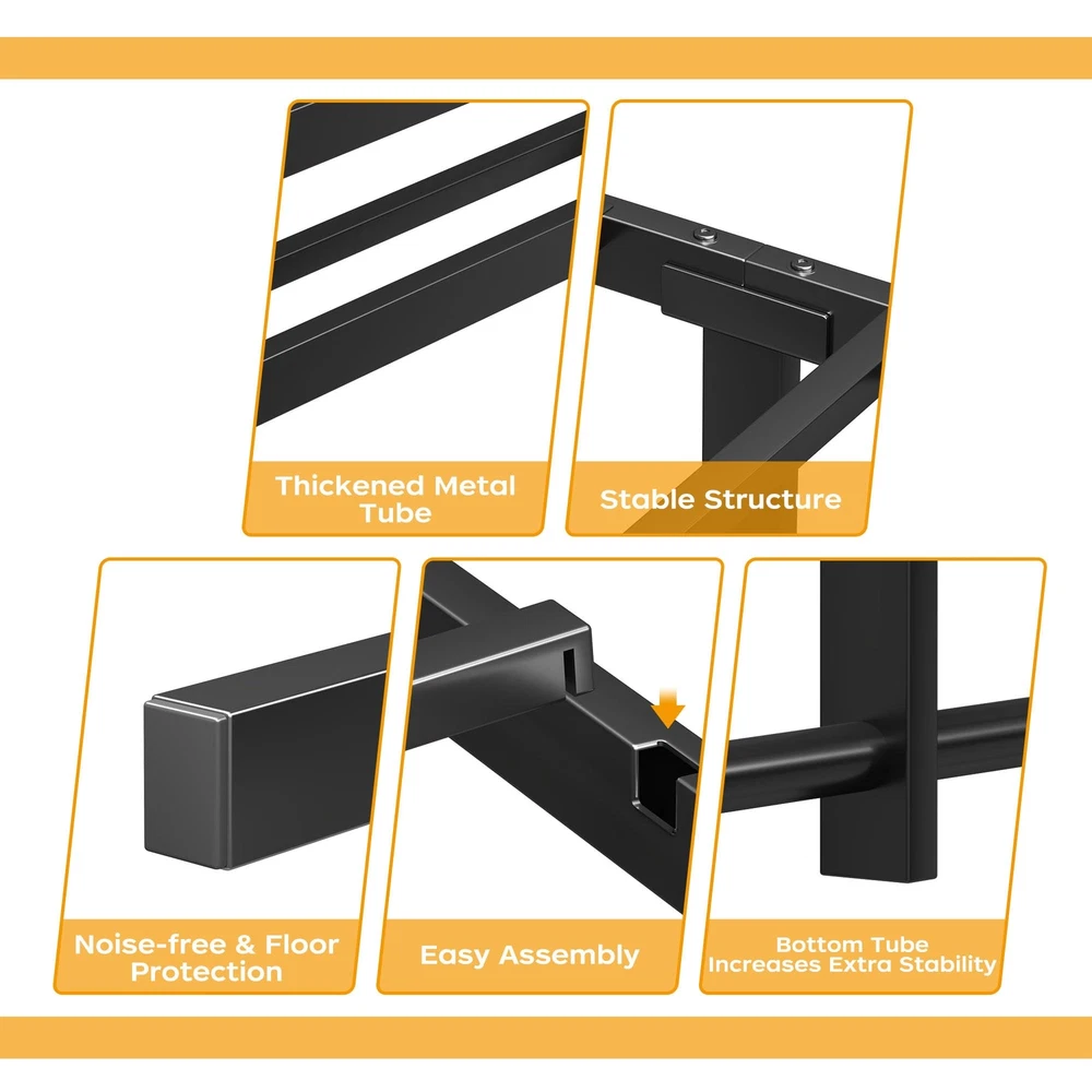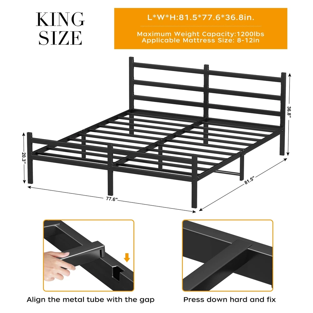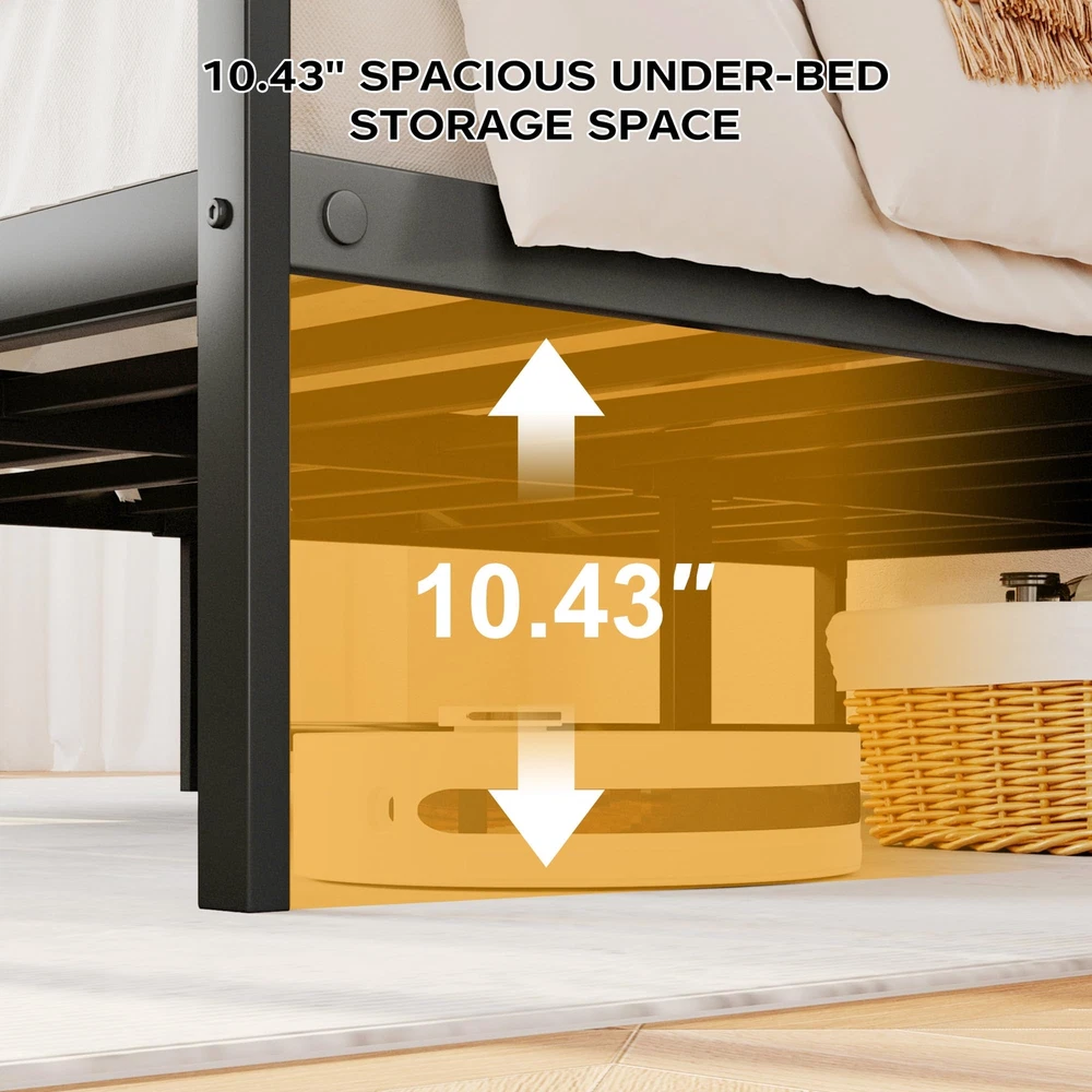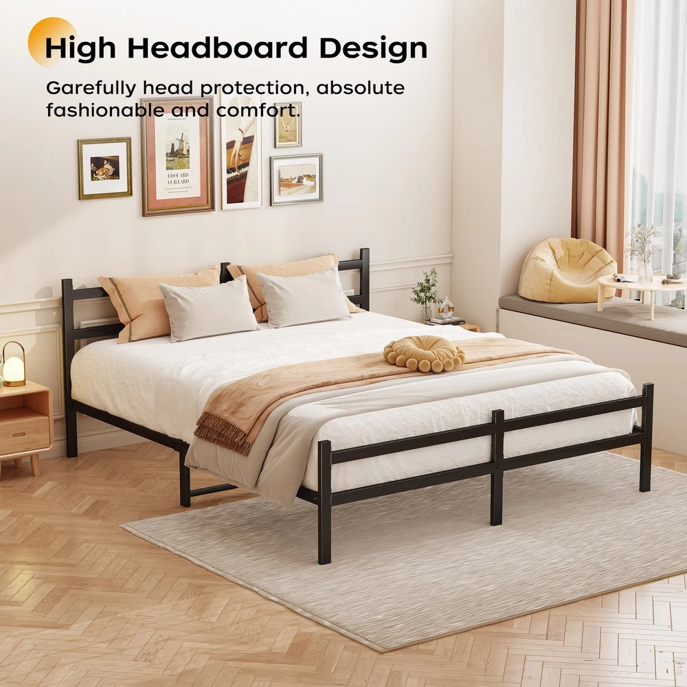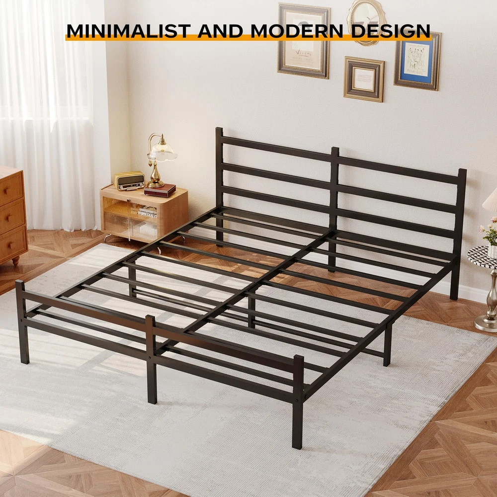 bed frame Minimalist Modern Design:The sleek and minimalist design of this metal bed frame allows it to seamlessly blend into any bedroom interior. Whether you have a modern or traditional style, this bed frame can effortlessly elevate the overall look and feel of your space. The neutral color and clean lines make it a versatile choice for various bedroom décors. Easy Assembly:This bed frame is designed to provide a hassle-free installation process. With its simple and sturdy design, it can be easily assembled without the need for any additional tools or complicated instructions. It is made from high-quality iron material, ensuring long-lasting durability and stability. Sturdy, Stable & Durable:This bed frame is built with a focus on providing a secure and comfortable sleep experience. The sturdy construction ensures that the bed frame can support your mattress and weight without any wobbling or creaking noises. You can enjoy a restful night's sleep knowing that this bed frame is reliable and built to last. Versatile compatibility with Various Mattress Sizes:This bed frame has been designed to accommodate a wide range of mattress sizes, including twin, full, queen, and king. Whether you already have a mattress or plan to upgrade in the future, this bed frame will ensure a perfect fit. Its adjustable design makes it compatible with different mattress thicknesses as well, providing flexibility and convenience for all your bedding needs. Noise-free and Under-bed Storage:With ample storage space underneath, this iron bed allows you to keep your bedroom tidy and clutter-free.The sturdy construction of this bed ensures minimal noise, providing a peaceful sleeping environment.