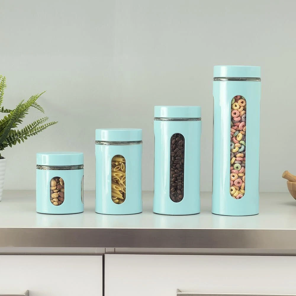 Store candy, sugar, trail mix and more with this 4 piece Canister Set. Made of heavy duty steel, it features a clear window along the center of the base to allow you easily see the contents of each canister. The vibrant finish adds a splash a color to your kitchen and provides a fun way to neatly organize your food. STORES SNACKS, CANDY, AND DRY INGREDIENTS: For all of your loose dry foods that need sturdy storage, use this sturdy set of four canisters to help provide storage. Place coffee beans, rice, flour, sugar, cereal, and candies inside for easy access MADE FROM QUALITY GLASS AND METAL WITH SEE-THROUGH WINDOWS: Each kitchen storage container is crafted from quality glass and a metal finish, with an illuminating finish that adds a bold modern touch to your kitchen. At the fronts of all four of them are clear windows for easily viewing your items. All the canisters are also equipped with twist-off lids that secure your contents PLACE ANYWHERE FOR A RETRO LOOK: These canisters are able to be placed anywhere in your household from a table to the countertop to help provide a stylishly retro look. They can also be stored more discreetly in your pantry or cabinet STORES OTHER ITEMS: Along with food, these pantry organization and storage canisters also provide storage for other items as well. Place pens, pins, clips, hair accessories, and even small jewelry inside for simple storage FOUR DIFFERENT SIZES FOR ALL YOUR FOOD STORAGE NEEDS: Four canisters are included, which vary in different sizes, and whether you are storing a lot or little, you will always have the right canister to accompany you. The capacities for these containers are 2 1/2 cups, 4 cups, 5.5 cups, and 7.5 cups