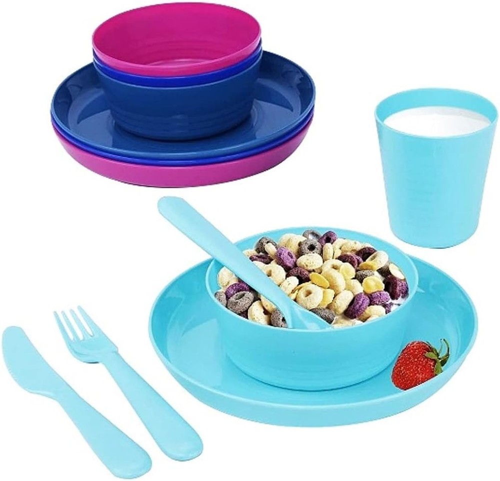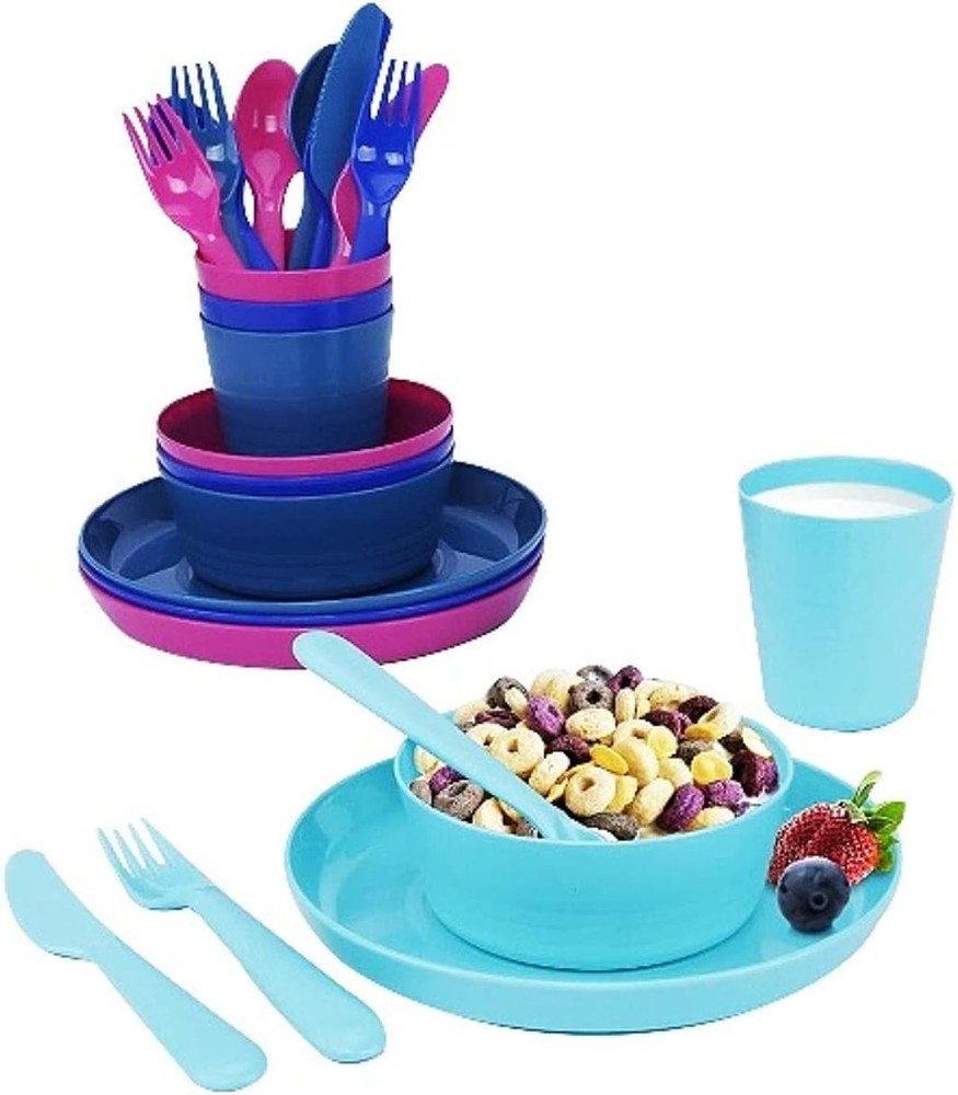 Klickpick Home Plastic Dinnerware Set Of 24 Pieces 4 colors Kids Assorted Product Details Color: Assorted Brand: Klickpick Home Pattern: Solid Collection Name: All Item Weight: 1.21 Pounds Finish Type: Glossy Product Care Instructions: Machine Wash Material Type Free: BPA Free Is Microwaveable: Yes Package Dimensions: 9.84 x 8.74 x 4.96 inches Item Weight: 1.21 pounds MaterialOccasion: PlasticAll Occasions ShapeIs Dishwasher Safe: RoundYes 24 pcs Colorful Dinnerware set Perfect for Toddlers,kids includes 4 different colors , Made with Durable,Light weight , break resistant Premium Quality Polypropylene Plastic Full dinnerware set- 4 Plates (7.25 Inch) , 4 Bowls(15 ounce) , 4 Cups(8 ounce), 4 Spoons, 4 Knives ,4 Forks Our Dinnerware set made with material which is reusable , Dishwasher - microwave safe, No harmful chemicals addes , good for store your food in freezer TESTED FOR SAFETY BY A 3RD-PARTY: No lead, BPA, phthalates, chemicals & toxins. Klickpick Home 24 Pieces Dinnerware set with 6 Different colors Set Includes: ☆ 4 knives ☆ 4 forks ☆ 4 spoons ☆ 4 bowls ☆ 4 plates ☆ 4 cups ★REUSEBLE & UNBREAKBLE: The dinnerware set is made of high quality pp material that is durable made to last and will not break even you are dropping it with force. ★MICROWAVE & DISHWASHER SAFE: The dishes are perfect for warming your child’s dinner using a microwave, making easer to serve your child a warm meal, and you can just put in the dishwasher and get it back clean in no time. ★ COMPACT & LIGHTWEIGHT: These plates, bowls, & cups are stackable to save space and weighs less then 2 pounds making it perfect to storage and carry to your picnic and party. ★FUN ASSORTED COLORS: Our shatterproof dinnerware set for children is available in bright and vibrant colors that will Add a Touch of Fun To Your Child’s Meal Time. ★BPA FREE: We used only the highest quality and most durable plastic that is completely free from any kinds of toxins or harmful materials to bring you plastic eating utensils for kids:
