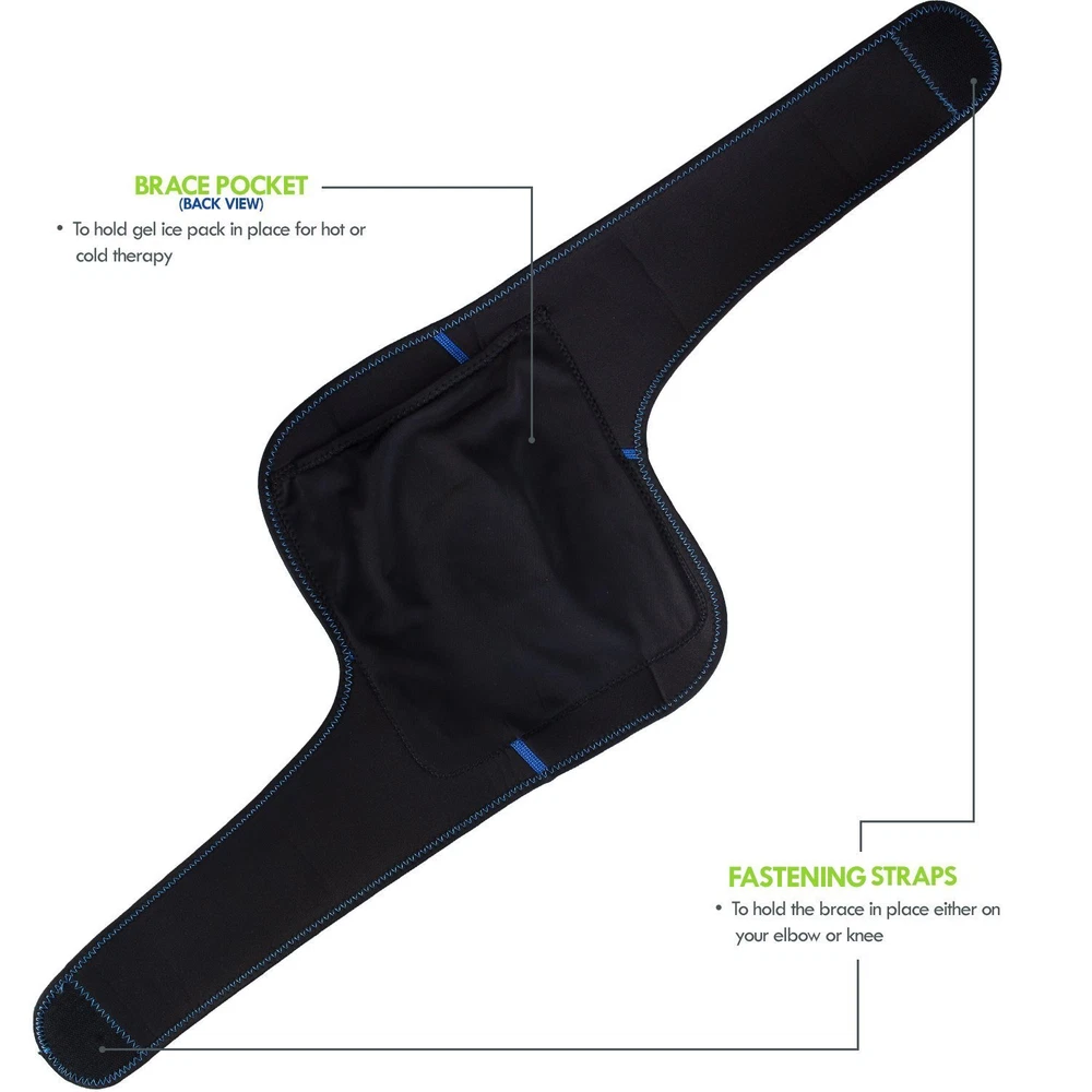 Knee & Elbow Wrap with Gel Ice Pack by An effective all-around solution for your knees and elbows: comfort, circulation, compression, mobility, support and pain relief! FEATURES ✓ Help support full natural movement, circulation and compression on your knee or elbow. ✓ Designed as an adjustable one-size-fits-all wrap that has opposite straps with strong fastener closures to help secure and tighten it in place comfortably. ✓ Front circular opening promotes proper motion and help reduce pressure on the patella / joint. ✓ Includes an inside pocket to insert the included flexible gel ice pack — perfect for hot or cold therapy on your limbs! ✓ Useful for pain relief and recovery from meniscus tear, ACL, tendonitis, tennis elbow, arthritis, runner's knee, swelling, surgery, muscle strain, and more. CONTENTS - 1 piece of adjustable latex-free wrap made of stretchable neoprene (65%), nylon (20%) and polyester (15%) that is 32.5" long and 10.5" wide - 1 non-toxic reusable gel ice pack contained in leak-proof nylon (7.3" x 8.5") which can be used for both hot and cold therapy. ADDITIONAL NOTES - To clean the wrap, handwash it gently in cold water with mild detergent and dry it flat. Do NOT iron. - For gel ice pack, limit application to only 20min at a time and repeat every 2 hours as needed. - Gel will become too hard in sub-zero freezers; let it thaw a bit before use. OUR GUARANTEE ✓ PREMIUM products, SECURE checkout and OUTSTANDING customer service. Please get in touch with us for any inquiries or concerns. ✓ 1-Year Warranty (FREE No-Hassle Replacement!) Gain the best support for your knee& elbow — buy this wrap NOW before our SALE expires! 2-IN-1 FEATURE KNEE & ELBOW WRAP WITH HOT & COLD THERAPY GEL ICE PACK: A one-size-fits-all wrap for your knee or elbow that will help promote full natural movement, circulation, compression, and recovery. Plus, with the inclusion of a non-toxic reusable gel ice pack (7. 3" x 8. 5") which you can insert in the wrap's inner pocket, the wrap will transform into an effective hot or cold pack that's suitable for pain relief.