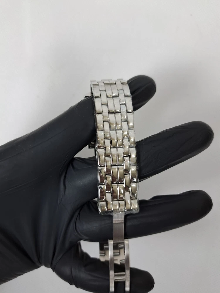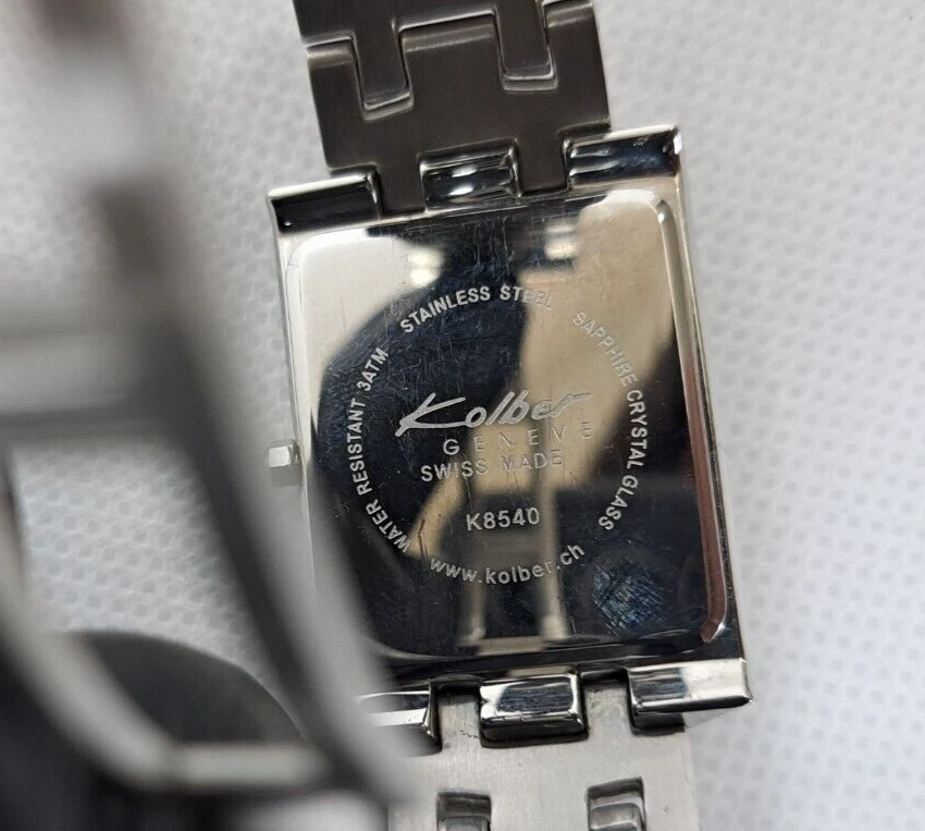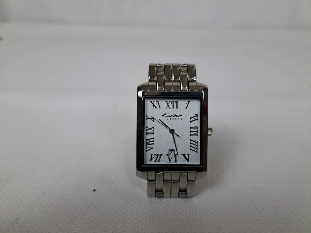 This Kolber Geneve men's wristwatch is a timeless piece crafted with precision in Switzerland. It features a silver stainless steel case with a double-locking fold-over clasp and a white dial with Roman numeral indices. The watch is powered by a Swiss quartz movement and is water-resistant up to 30 meters. With a vintage style and a rectangular shape, this watch is perfect for both dressy occasions and casual outings. It comes with a bracelet band in silver and is suitable for left-handed men. The watch is not handmade and does not come with papers, service records, or original box/packaging. Shipping From Pakistan Delivery in 7-10 working Days!!!