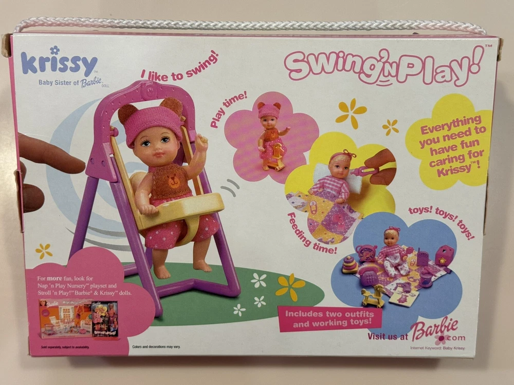 This Krissy Baby Sister of Barbie Swing'N Play #54217 is a must-have for any doll collector. This doll playset comes with accessories and includes a 3-inch doll with straight blonde hair, blue eyes, and a light complexion. The doll is made of cloth and plastic materials and is an original Mattel product manufactured in 2001 in China. This doll playset is perfect for all occasions and is ideal for children who love to play with dolls. The set includes only one piece, and it is a single unit. The doll's ethnicity is Caucasian, and it is a girl doll. The doll is not antique, vintage, or an original/ licensed reproduction. The doll's theme is babies, and it belongs to the Barbie franchise.