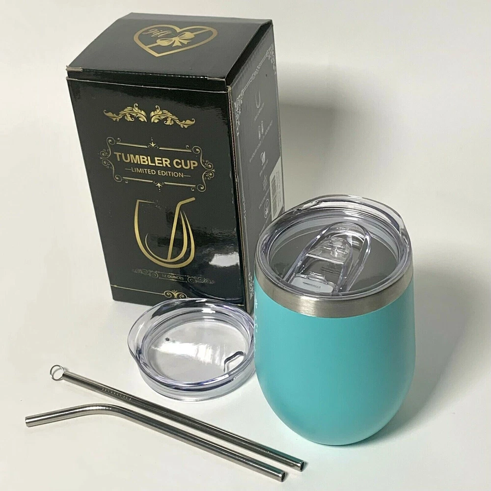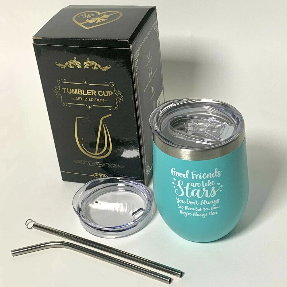 "Good Friends Are Like Stars" Stainless Steel Tumbler Cup - New in Box Contains 2 different lids, stainless straw and cleaning brush Color: Aqua Limited Edition 12 ounce capacity 4-1/2" tall - 3" mouth diameter 6+ hours cold - 3+ hours hot Vacuum insulated ***You should view and enlarge all photos for detail and condition verification*** My goal is to provide excellent customer service If you have any issues upon receipt, please contact me immediately